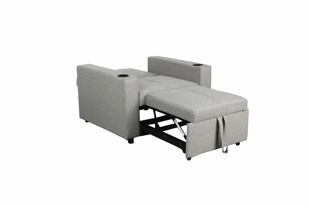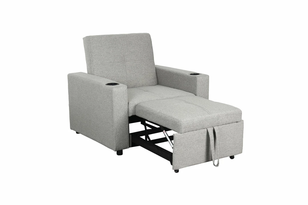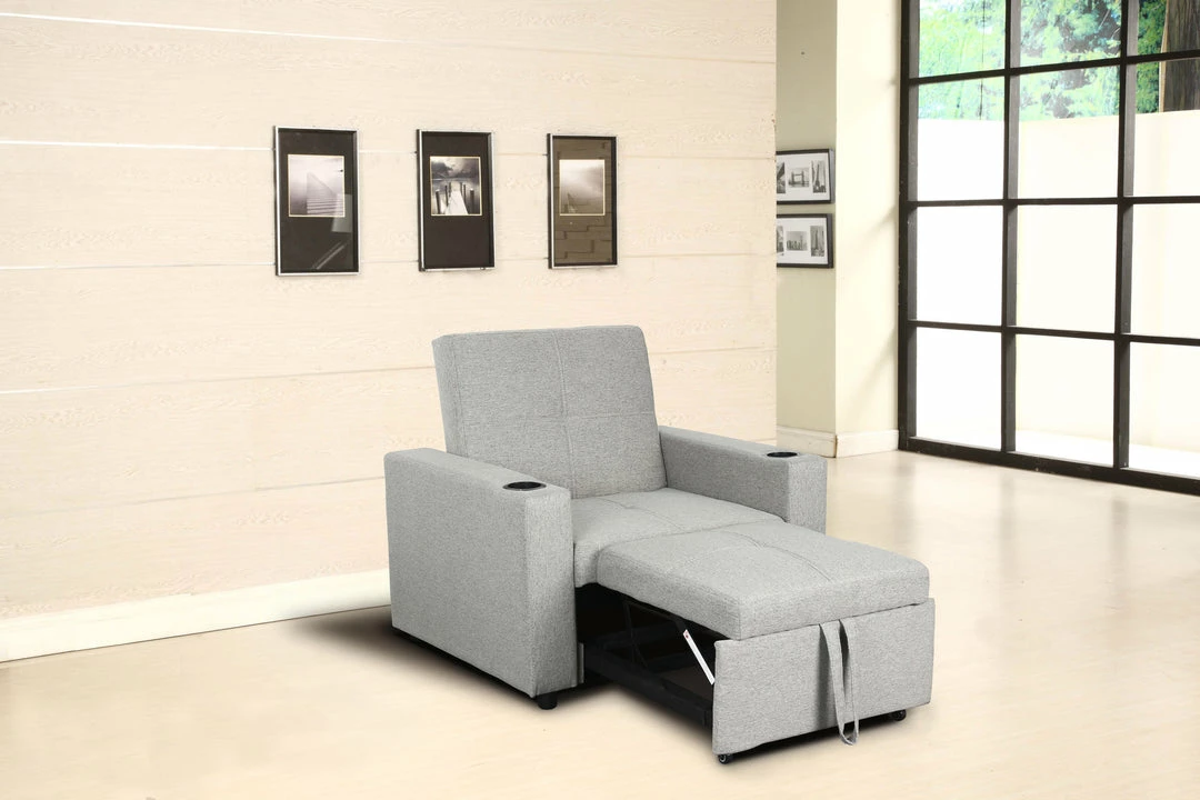 This compact pull-out sleeper chair provides an innovative sleeping solution without taking up the whole room. Featured in a neutral grey with cupholders.