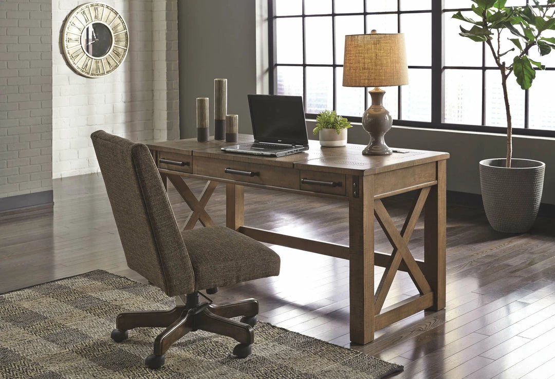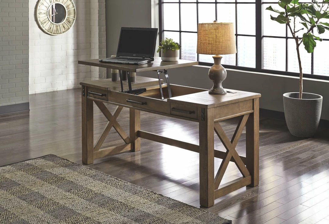 Made with pine veneers and solids, finished in a distressed weathered gray color. Desk features stocky cross-buck leg design for a farmhouse appeal. H837-54 desk has an AC power supply with (2) USB charging ports. H837-54 is a stand-alone lift-top desk.