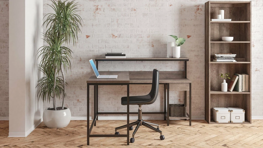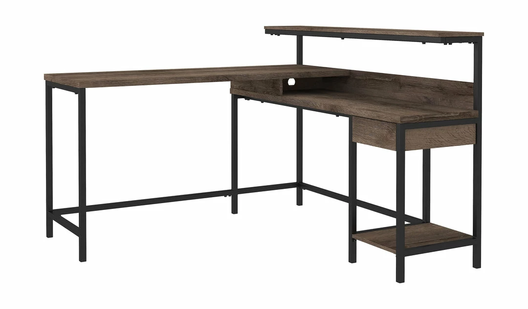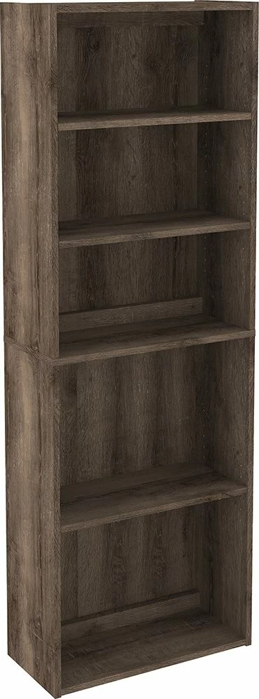 Modern farmhouse design with an Urban attitude. Made with a paper laminate featuring a replicated weathered oak grain and engineered wood substrate. Black metal frames. Each piece is thoughtfully designed to offer style and function to any home office. Drawers use ball bearing side glides for smooth operation. Doors use European style hinges. Desks are designed for easy cord management. These items are designed to be flat pack RTA for express ship opportunity. H275-15 small bookcase is 30’H with one adjustable shelf. H275-16 medium bookcase is 36’H with two adjustable shelves.