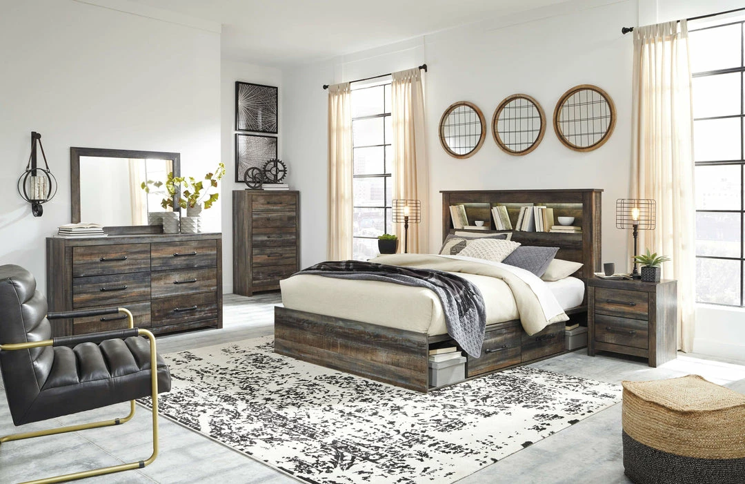 Burnt orange and teal colors accent a brown rustic finish in a replicated woodgrain with authentic touch. Large scaled dark colored handles. Cases feature a framed front and pilasters. All panel headboards (53,57,58,87) feature decorative matte black sconce lights. Side roller glides for smooth operating drawers. All panel headboards (53,57,58,87) can attach to a bolt-on metal bed frame B100-31 or B100-66 respectively. Drawers lined with a faux linen laminate for a clean, finished look. Slim profile dual USB chargers located on the back of the night stand top and the side of the headboards. All side storage options (50,150,60,160) requires the use of the B100-11, B100-12, B100-13 or the B100-14 roll slats. All under bed storage units (50,150,60,160) accommodates to 10.5″W x 10.5″D x 11″H cube storage bins. LED lights accent bookcase headboards (63,65,69,85). All beds have a panel footboard (52,84,54,56) and storage footboard option (52S,84S,54S, 56S). Queen (65) and king (69) headboards can attach to a bolt-on metal bed frame B100-21, B100-31 or B100-66 respectively. Twin (63) and full (85) headboards can attach to a bolt-on metal bed frame B100-21. Safety is a top priority, clothing storage units are designed to meet the most current standard for stability, ASTM F 2057 (ASTM International). Drawers extend out to accommodate maximum access to drawer interior while maintaining safety.