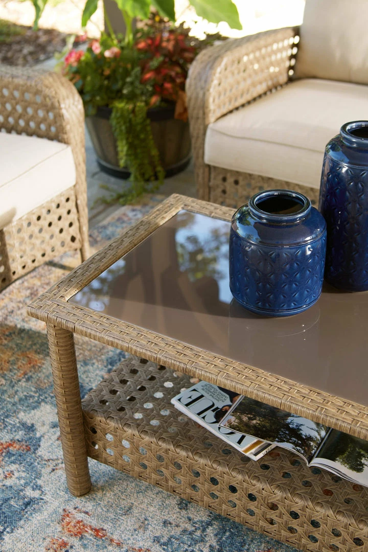 Bring a beach house look and feel to your outdoor living space with this Braylee set. With this cool and casual outdoor furniture set, every day feels like a day at the beach.