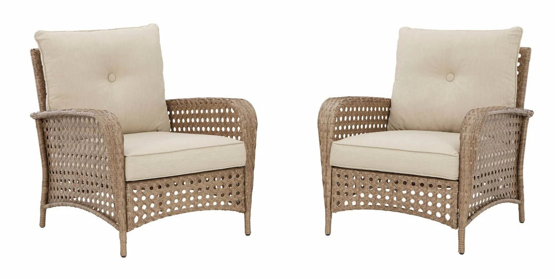 Bring a beach house look and feel to your outdoor living space with this cushioned lounge chair set. Made of driftwood resin wicker over a powder coated steel frame, it features beautifully neutral beige cushions made of high-performance Nuvella® fabric that is colorfast and easy to clean. With this cool and casual outdoor furniture set, every day feels like a day at the beach.