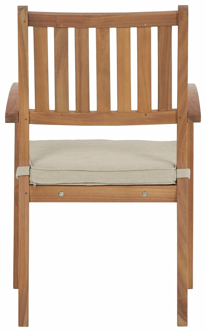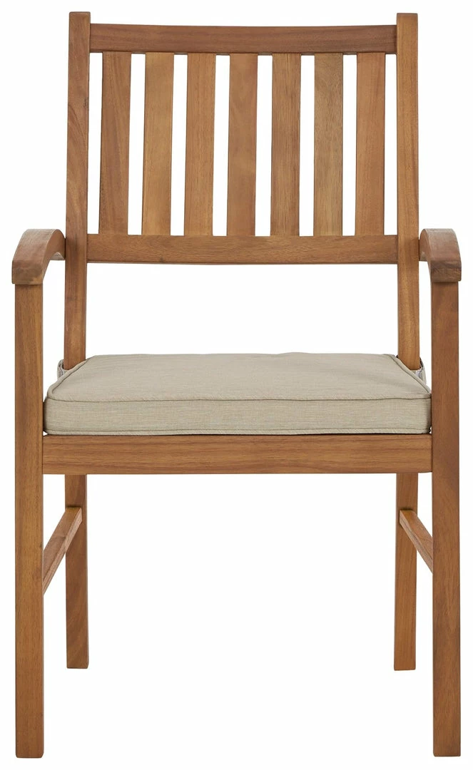 There’s no need to be stuck inside when the weather is perfect. Enjoy an alfresco gathering with this outdoor arm chair and cushion set. Made of solid acacia wood, this chair set is built to keep its looks with a slatted seat that sheds rainwater and weather-friendly cushions covered in Nuvella® high-performance fabric. You’ll love soaking in the scenery from here.