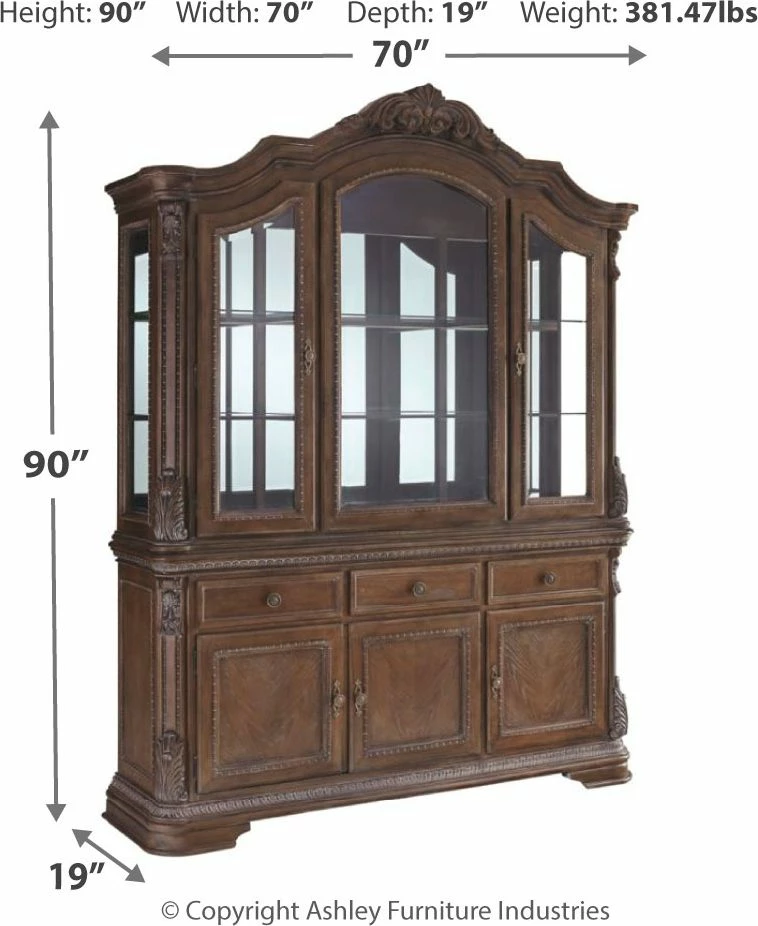 Classic traditional styling with an ornate flavor. Sophisticated dark brown oak finish with a white glazed accent. Tops feature book matched veneer with contrasting Ash swirl inlay border. Cases feature serpentine shaping with thick profiled tops and framed drawer fronts. Ornate round metal knobs finished in an aged bronze color. Shapely table top sits on double pedestal base with cast ornamentation and is designed to seat 6-10. Beautiful ornate chair frame with upholstered seat and back in beige color fabric. The dining room china is lighted.