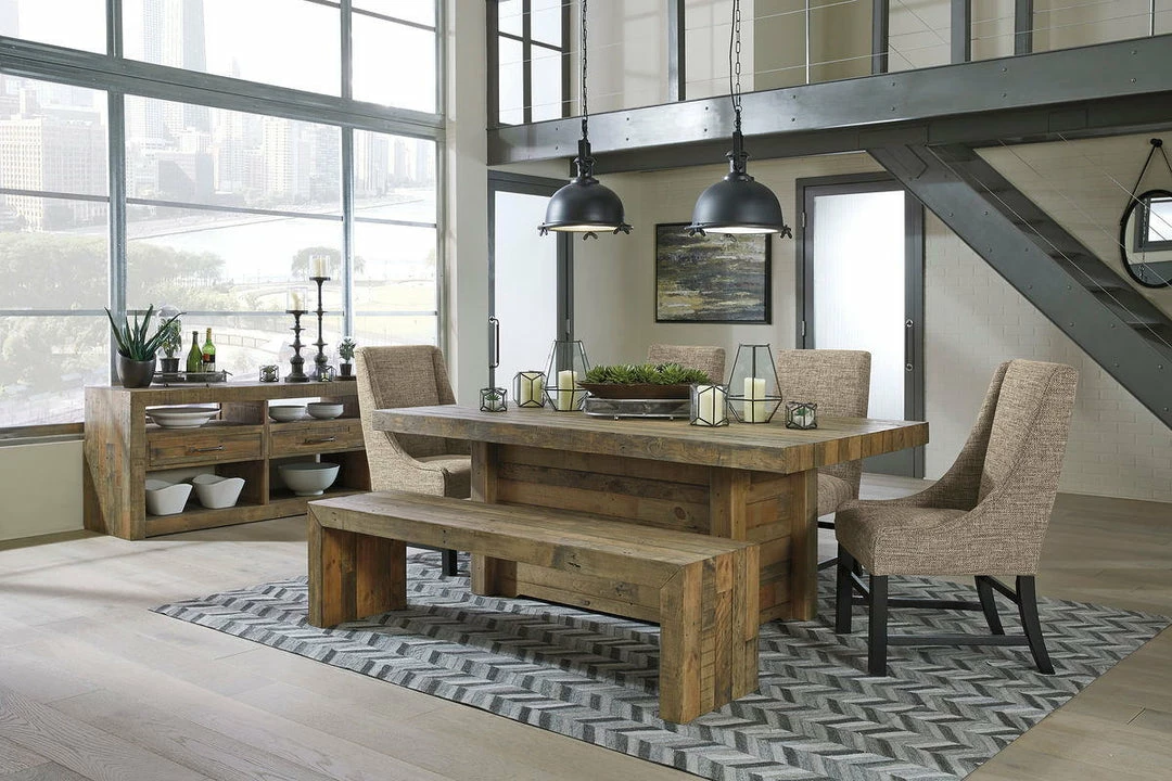 Rectangular table and server are made with reclaimed Pine solids in a long butcher block pattern with washed grayish brown textural finish that highlights the natural wood tones and nail holes. Arched bar pull hardware with nail head detailing in an industrial silver/bronze color finish. Pedestal table seats 8 comfortably while maintaining ample leg room. Large all-wood bench can seat 3. Server features contemporary rectilinear design with floating drawer boxes and has fully finished English dovetail drawer construction with ball bearing side glides.
