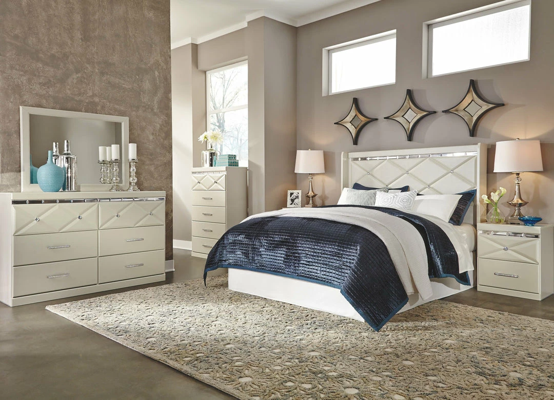 Champagne pearl stipple texture 3D pressed top case drawers. Diamond pattern shaped top drawers in a champagne stipple finish uses 3D press technology. Beveled mirror accent under moulding on case tops. Dazzling faux crystal accented handles and knobs. Champagne pearl stipple texture 3D pressed headboard panel with faux crystal buttons. Side roller glides for smooth operating drawers. Slim profile dual USB charger for the back of the night stand tops. Queen (57), king (58) panel headboards can attach to a bolt-on metal bed B100-31 or B100-66 respectively. Safety is a top priority, clothing storage units are designed to meet the most current standard for stability, ASTM F 2057 (ASTM International). Drawers extend out to accommodate maximum access to drawer interior while maintaining safety.