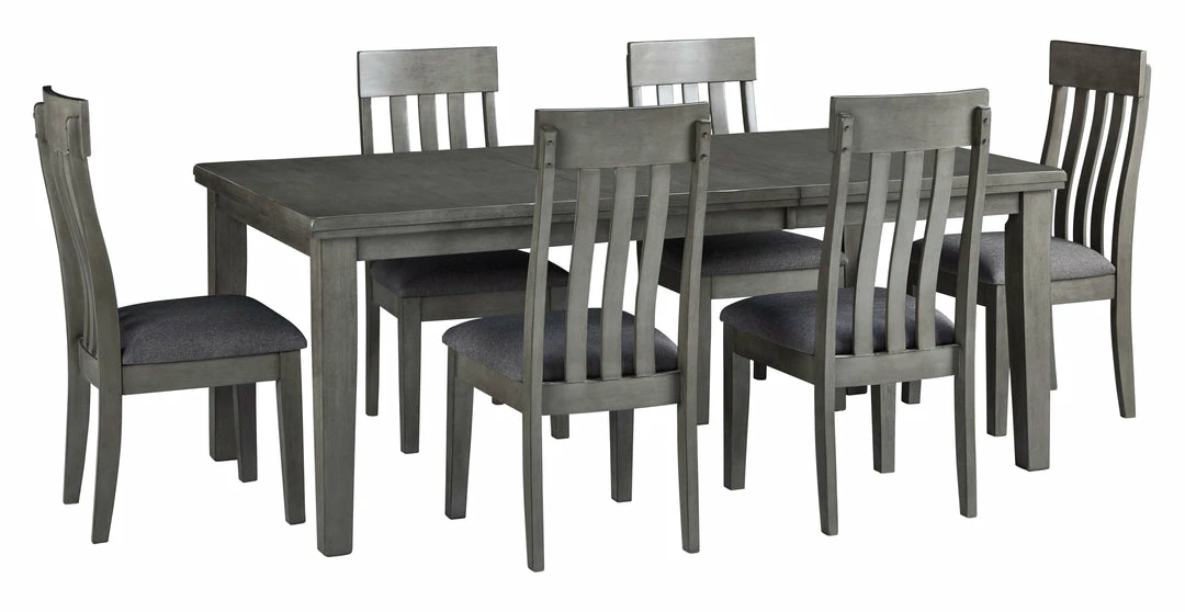 Casual lifestyle design. Made with hardwood solids, select Acacia veneer and engineered wood substrate. Finished with a trend-right antique gray color. D589-35 table features a thick sturdy top with self-storing butterfly leaf. D589-42 gathering table has a storage base and removable leaf for extra seating room. Solid wood chair frames with a contoured comb back design and cushioned foam seat upholstered in a gray textural polyester fabric. Matching bench for versatile seating options.