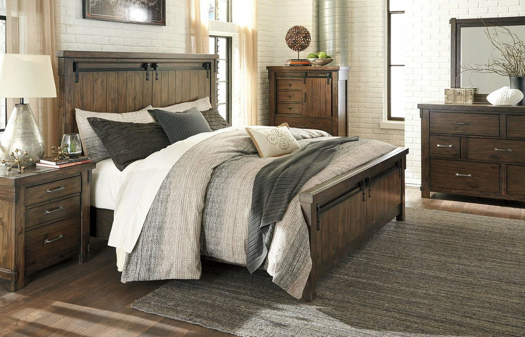 Made with Acacia veneers and select hardwood solids and finished in a dark brown color with a hint of a light industrial gray wash. Modern craftsman touches with the thru-tenon look throughout and generous scaling of the cases and pilasters. Bed features a chunky panel look with faux barn door panels with accenting metal hardware. Planked effect on the headboard and footboard. Cases feature planked tops and raised center panel. Night stand features an AC power supply with (2) USB charging ports. Fully finished dovetailed drawer boxes with ball bearing side glides. Hardware is an industrial bar pull with square back plates with a darkened zinc color finish. The B718-154/-156/-157/-158 bed design features a cantilevered bench incorporated into the footboard and a cross-buck panel headboard.