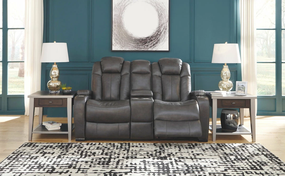 Looking for seating with all the bells and whistles? This loaded power reclining loveseat has you covered. Get double the relaxation—recline your body then adjust your headrest. Pull up the center console to stash your remotes. With USB charging ports, your devices will enjoy this loveseat, too. With four stainless steel cup holders, you’ll have drinks galore. All wrapped up in quality faux leather with fashion-forward jumbo stitching for a look and feel you’ll love.