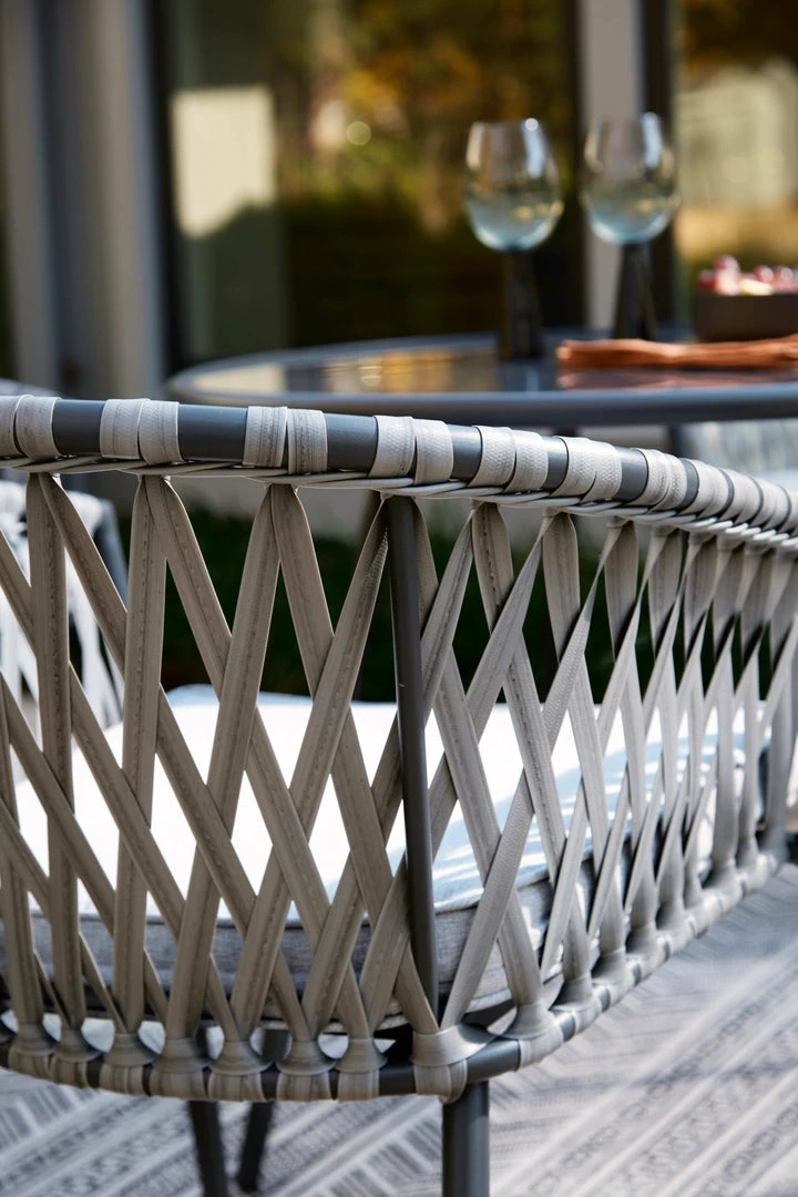 Gray powder coated steel frame. Chairs are stackable. Light gray lace wicker. Gray Nuvella fabric. 35″ round glass top dining table. Assembly required. Express Ship.