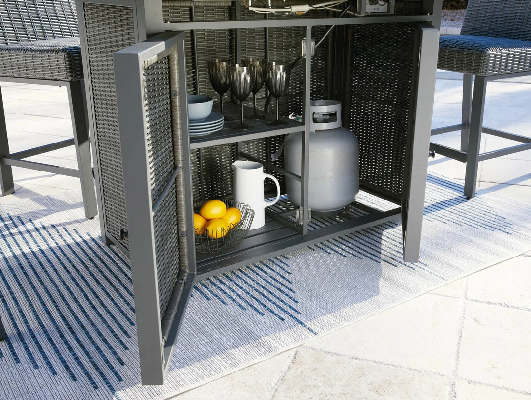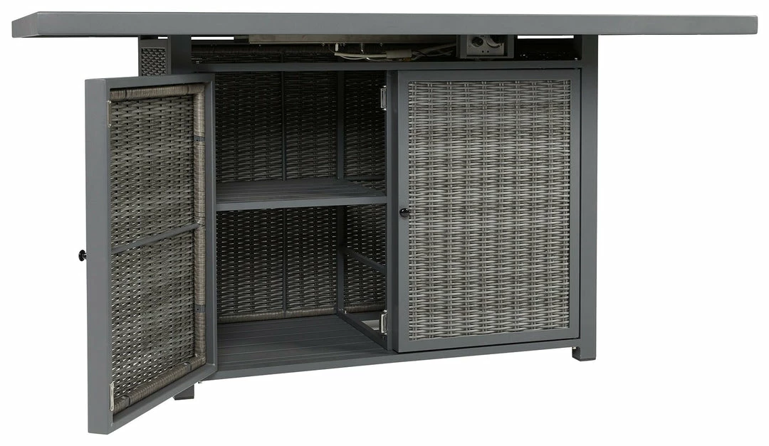 Turn your backyard into a hotspot for entertaining with this bar table with fire pit. Sporting a neutral gray finish, the rectangular table elevates the art of al fresco living. Its chic aluminum frame is paired with all-weather resin wicker for beauty and brawn. This outdoor table is enhanced with glass beads that add a dramatic element. Hidden storage shelves and a protective weather cover keep everything ready and waiting for impromptu entertaining.