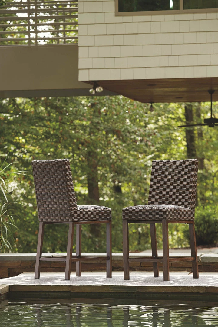 Collection has hand woven resin wicker with rust free aluminum frames with a brown wood-look finish. All cushions and throw pillows are made with Nuvella high performance fabric. Choose from dining, bar table and seating sets. For dining, choose from stationary dining chair or swivel rocker dining chair. 56″ square bar table includes 55,000 BTU CSA approved stainless steel burner, enclosed storage area with shelves. Stools have fast dry foam seats below the woven resin wicker to provide comfort. No seat pads needed for barstools. To order a 9-piece bar table set, order P750-130(4) and P750- 665. Assembly required for all skus.