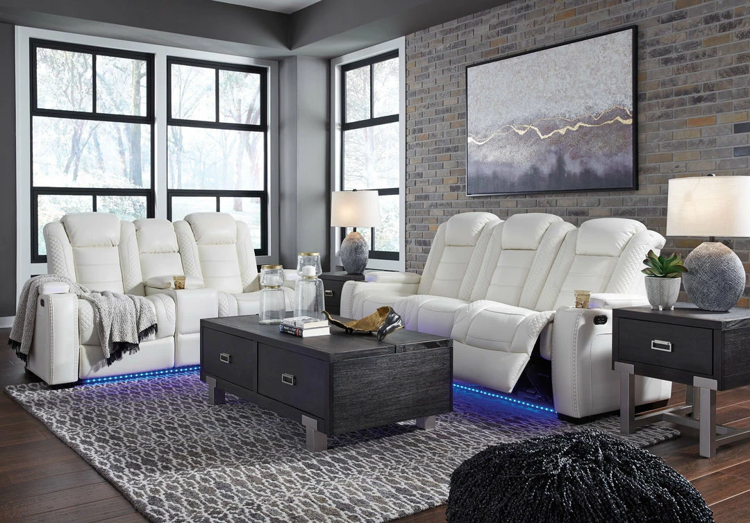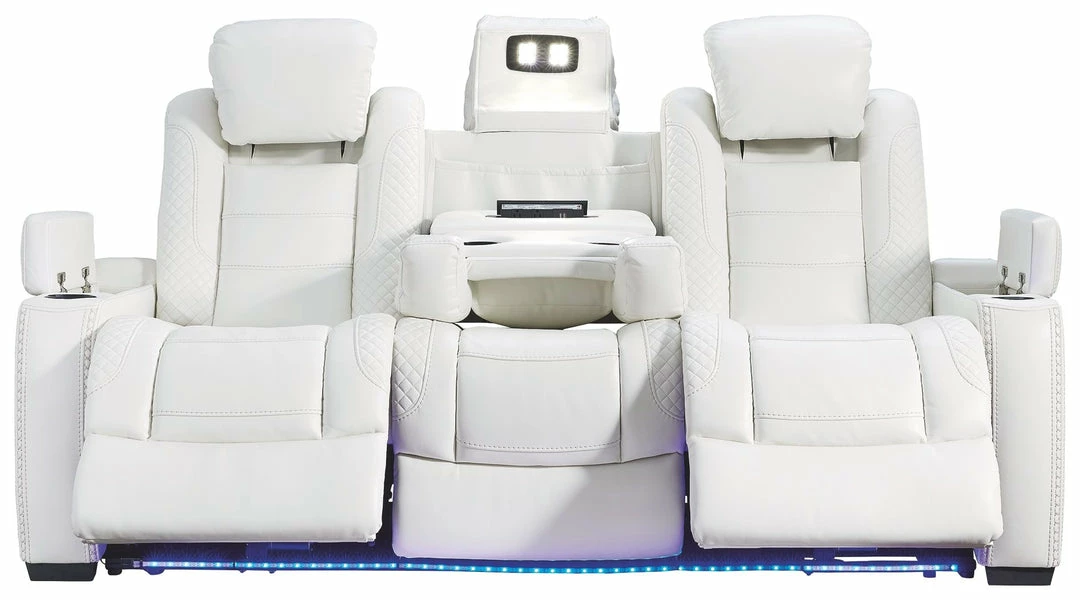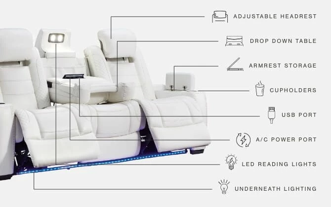 This power reclining living room set takes its cue from luxury automobiles with lattice and crosshatch stitching, for a richly tailored aesthetic that gives you plenty of reasons to celebrate. Sumptuously padded cushions and crisp white faux leather upholstery add to the indulgence. When it’s time to rev up the action, the dual reclining bucket seats, Easy View™ power adjustable headrests and center console with docking station keep you in the driver’s seat. Ambient blue LED lighting on the base and cup holders completes the theater-style experience.