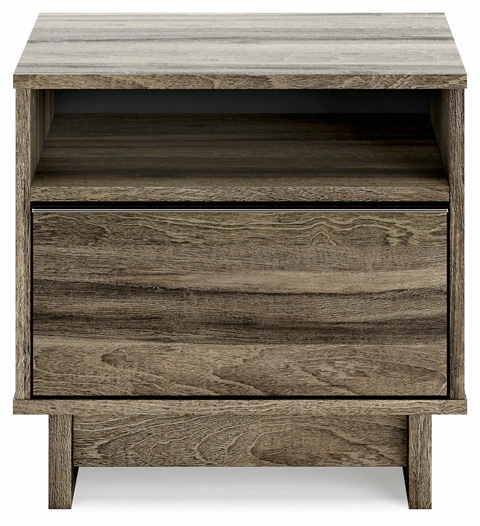 Your modern sanctuary is within reach. The subtle design of this nightstand is accented with a low profile base. Its weathered brown finish is complemented with refined champagne-colored handles on the smooth-gliding drawers. An open shelf provides additional bedside storage.