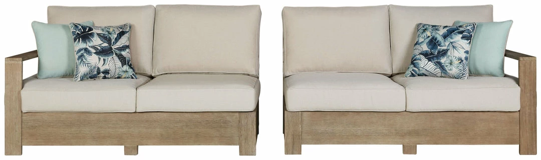 Eucalyptus cushioned wood sectional with Nuvella high performance fabric. P804-854/877 includes 6 throw pillows. Assembly required.