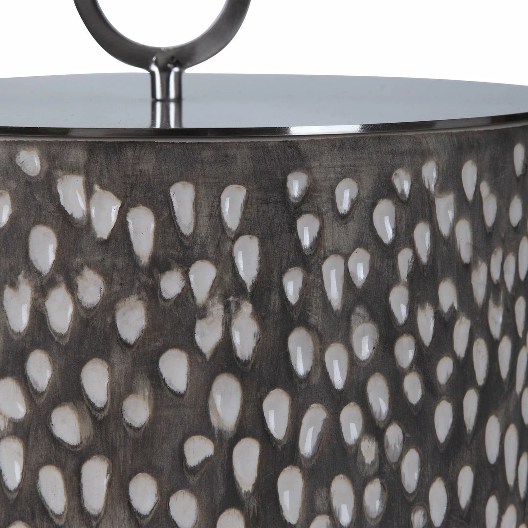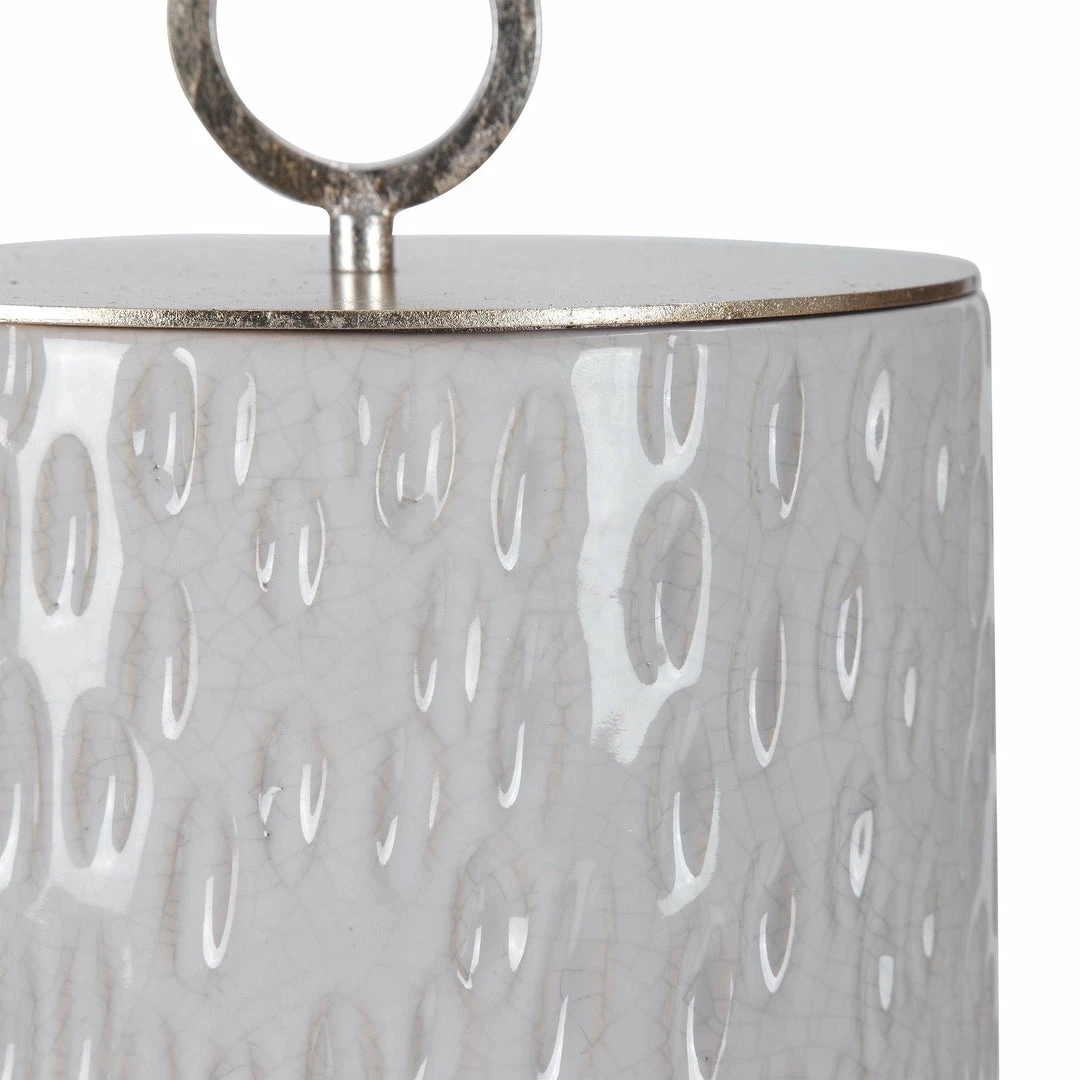 Ceramic Containers Feature Carved Detailing And Are Finished In Off-white And Smoke Gray Crackle Glazes With Respective Aged Gold And Brushed Nickel Finished Lids. Sizes: S-9x9x9, L-6x19x6