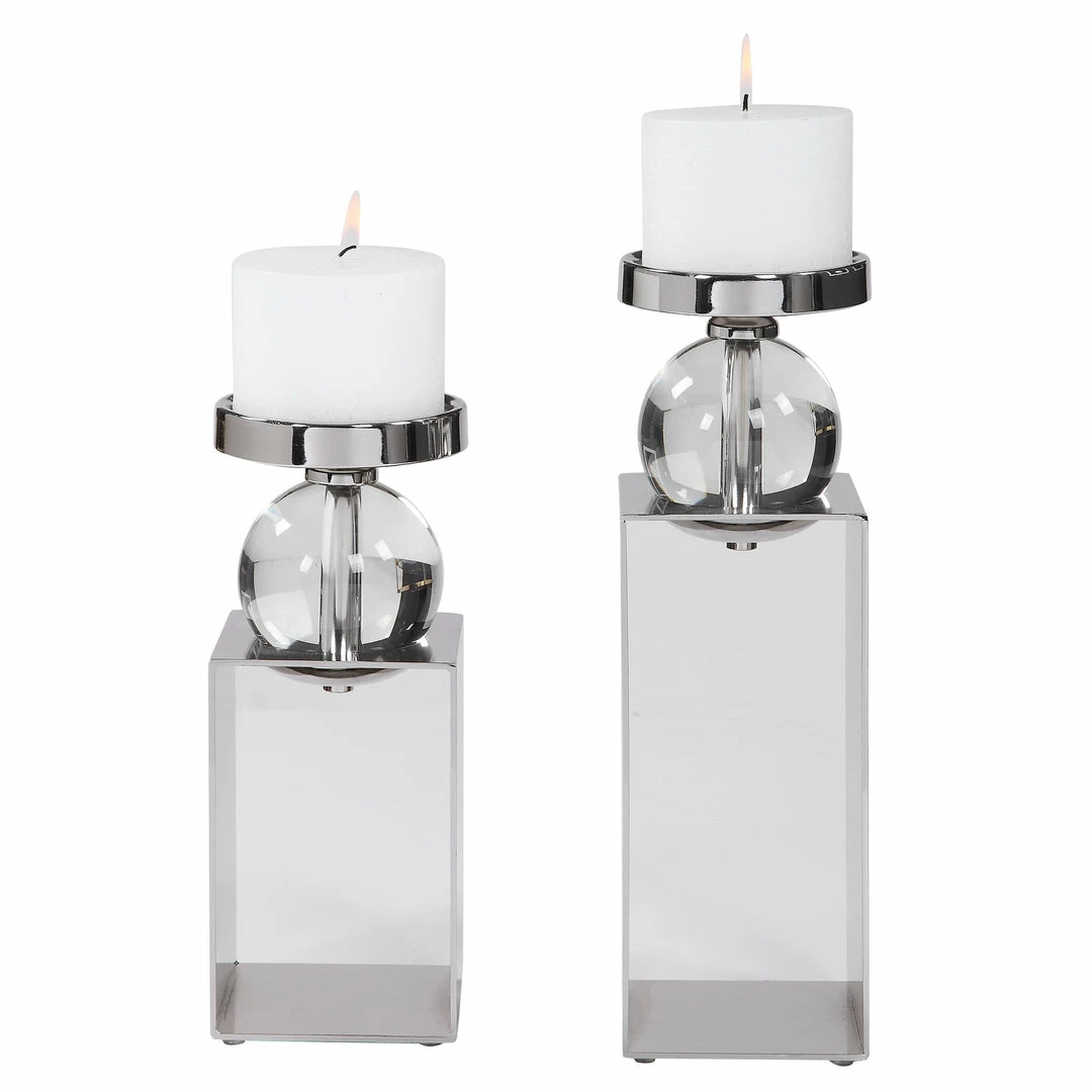 Set Of Two Candleholders Featuring An Open Steel Frame, Finished In Polished Nickel With Crystal Accents. Two 4″x 3″ Distressed White Candles Included. Sizes: Sm-5x12x5, Lg-5x15x5
