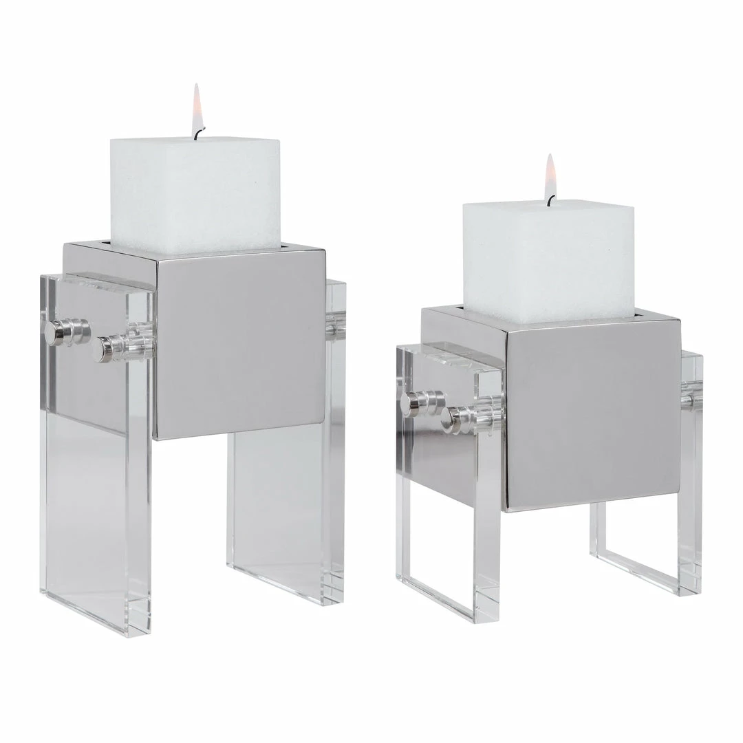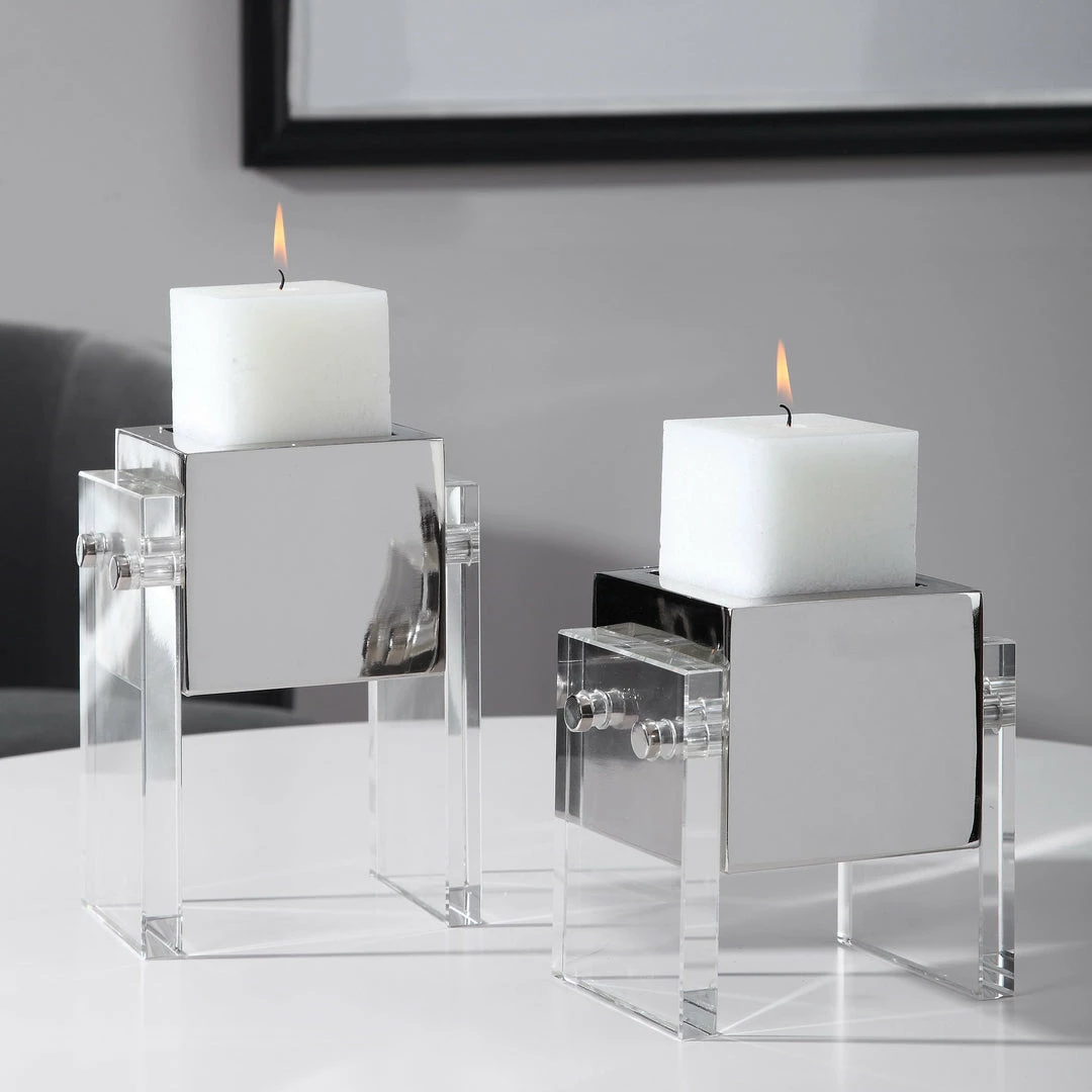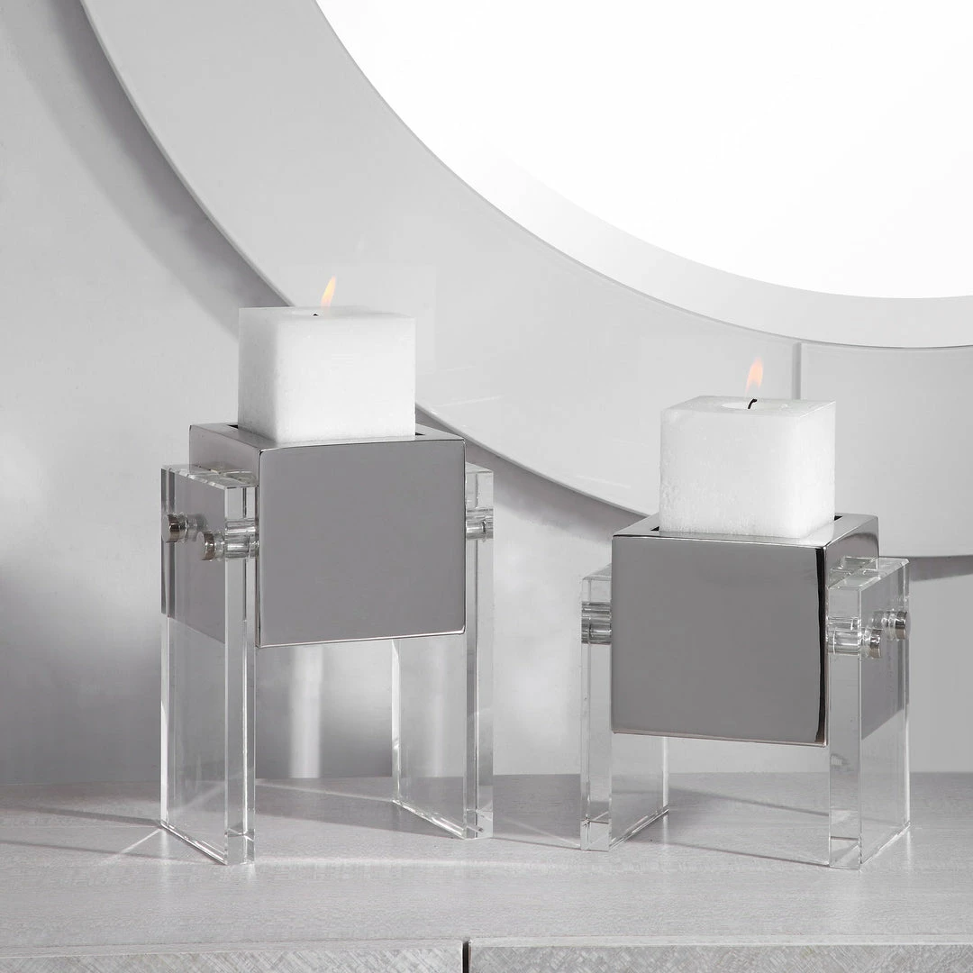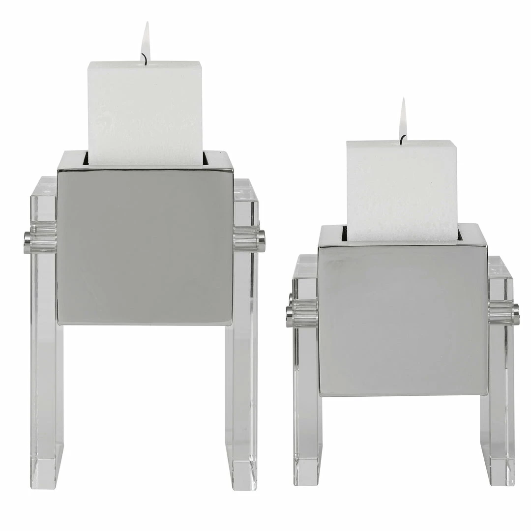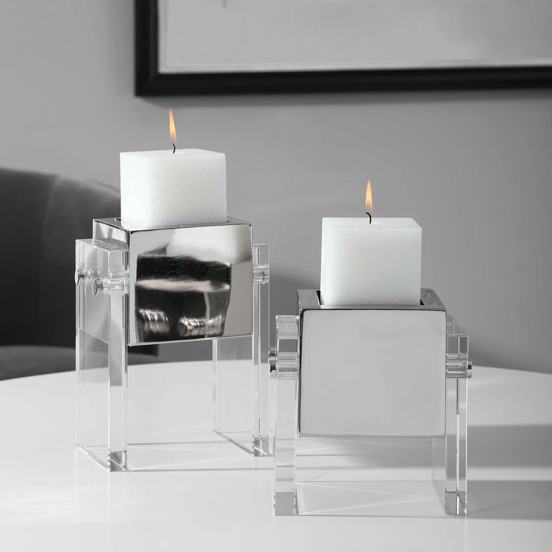 Set Of Two Crystal And Polished Nickel Candleholders. Two 3″x 3″ Distressed White Square Candles Are Included. Sizes: S-6x7x5, L-6x9x5