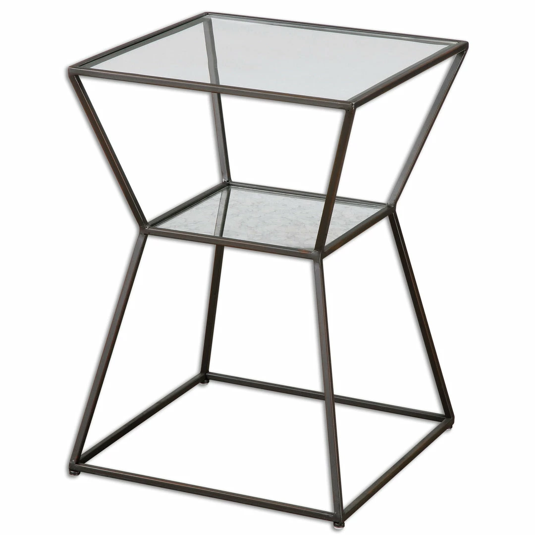 Reaching Across Many Design Styles, This Geometric Inspired Accent Table Features A Petite Iron Frame In Aged Black With A Clear Glass Top And An Antique Mirror Gallery Shelf.