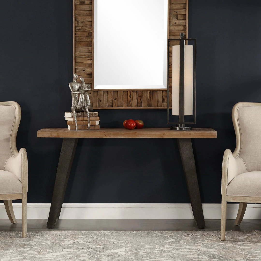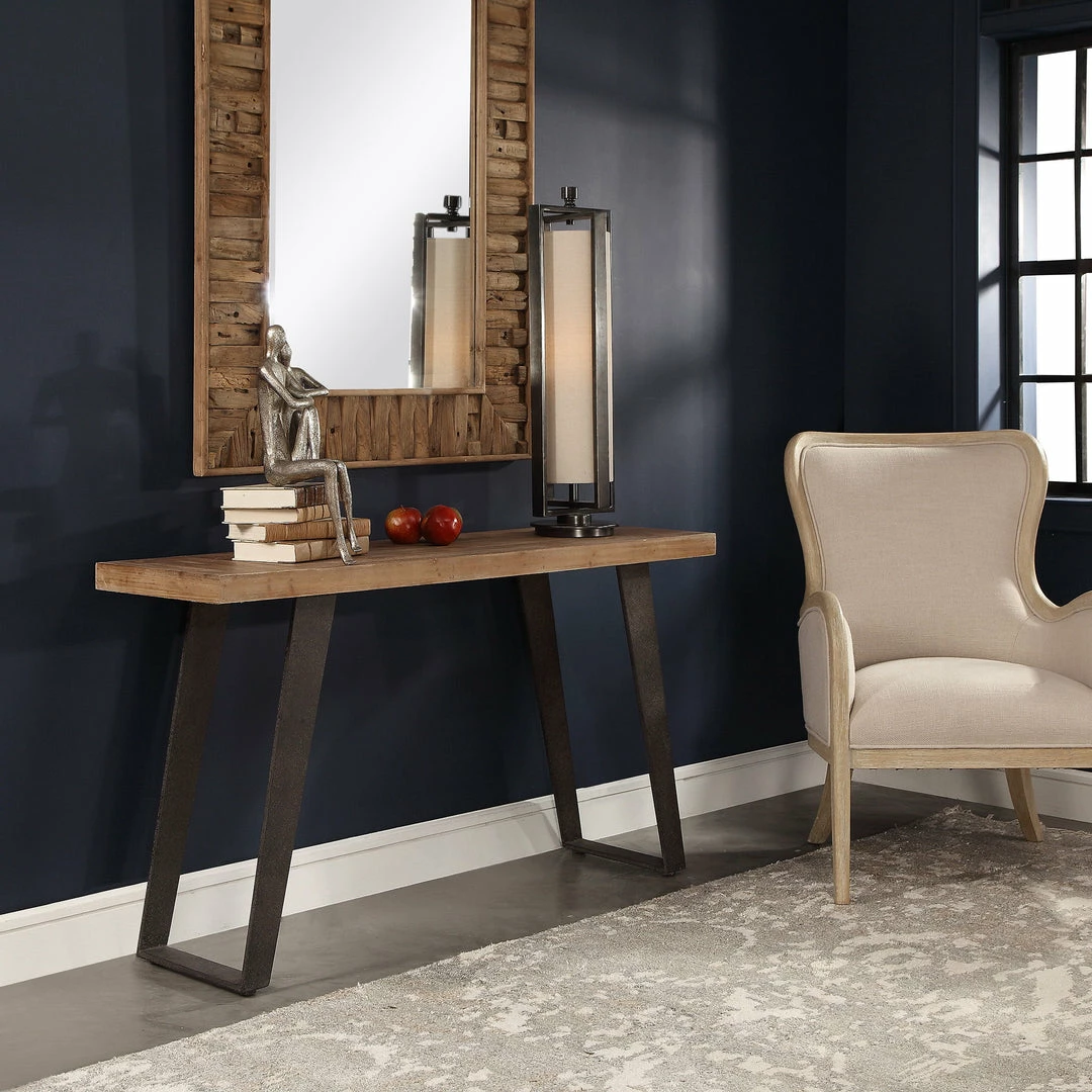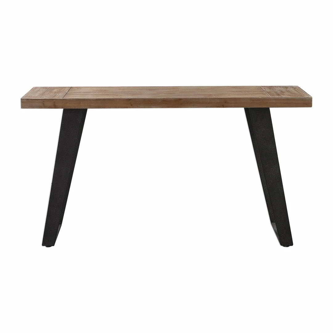 Constructed From Natural Fir Wood, This Console Table Features A Weathered Oak Finished Top Showcasing The Natural Wood Grain, Supported With Industrial Metal Legs Finished In A Textured, Aged Black Finish.