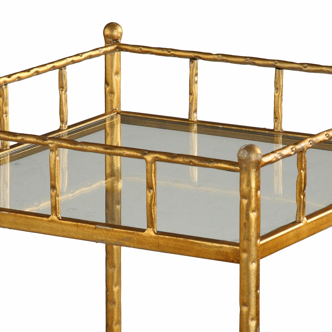 Add A Touch Of Glam With This Accent Piece Featuring Caged Tray Style Shelves With Hammered Texturing Finished In Bright Gold Leaf. Shelves Are Clear Glass.
