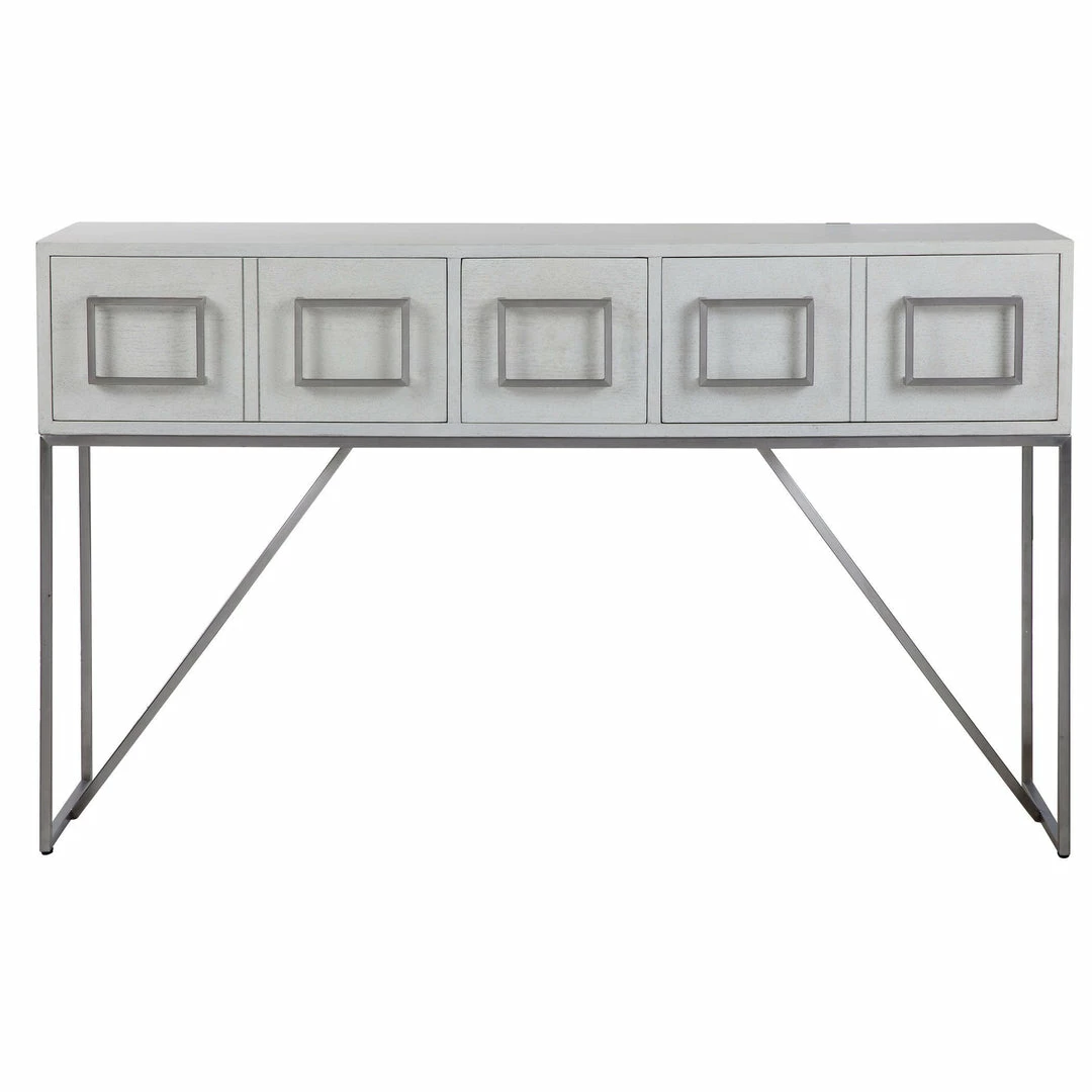 Clean Contemporary Styling, Featuring Oak Veneer Finished In A Soft White With Light Gray Distressing. Accented With Statement Hardware In Brushed Nickel Stainless Steel With A Coordinating Base. Has Two Double Drawers And One Single Drawer In The Center.