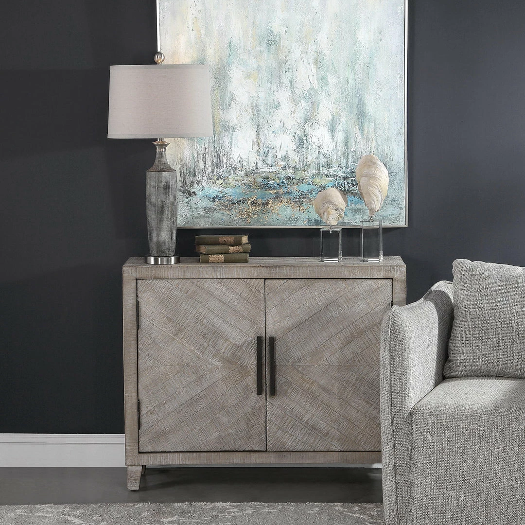 This Modern Farmhouse Two Door Cabinet Features Linear Textured Fir Wood, Finished In A White Washed Glaze With Oatmeal Undertones. Antique Bronze Iron Door Pulls Open To One Adjustable Shelf.