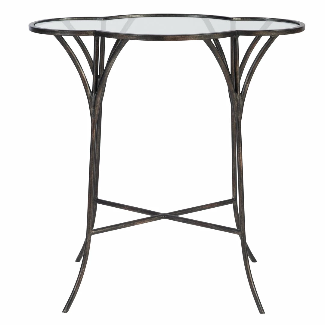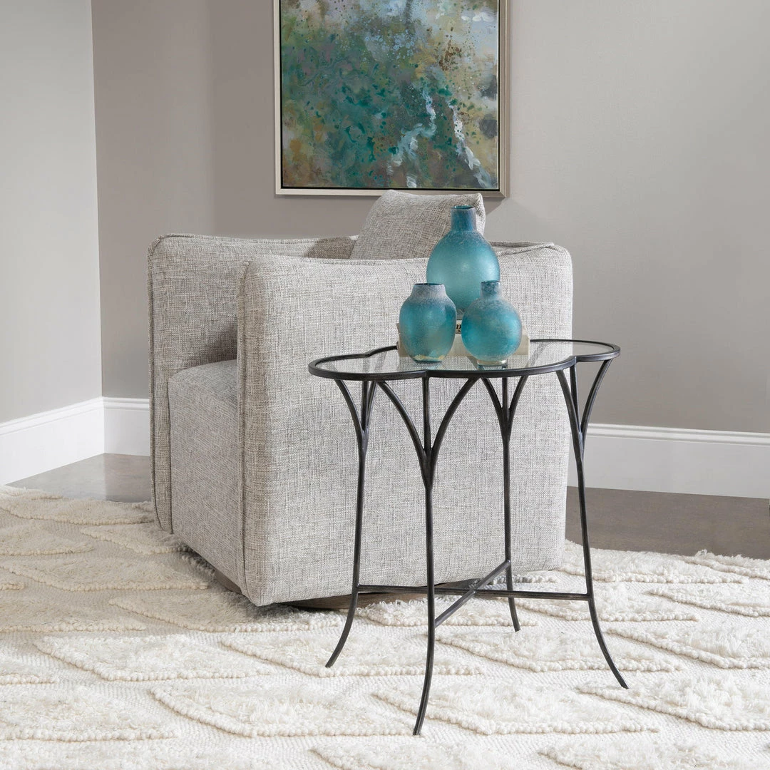 Whimsically Designed With Moroccan Roots, This Accent Table Features A Hand Forged Iron Framework Finished In Aged Black With A Scalloped Top With Clear Tempered Glass.