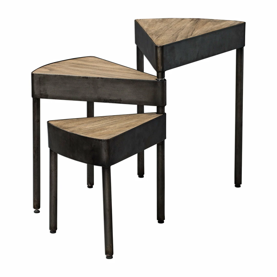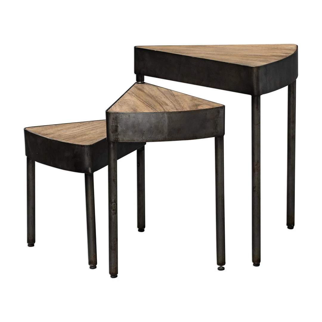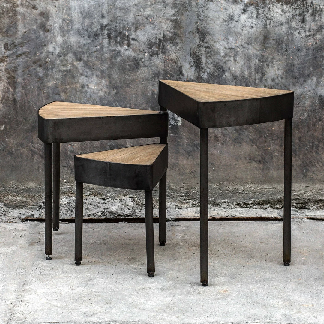 Featuring Versatile Functionality, This Contemporary Nesting Table Design Features Swivel Action Allowing You To Create The Shape With Three Tabletops. Mindi Veneer Tops Are Finished In A Natural Wheat With Thick Aged Steel Finished Supports. S- 12″x 15″x 15″, M- 14″x 19″x 17″, L- 16″x 24″x 20″