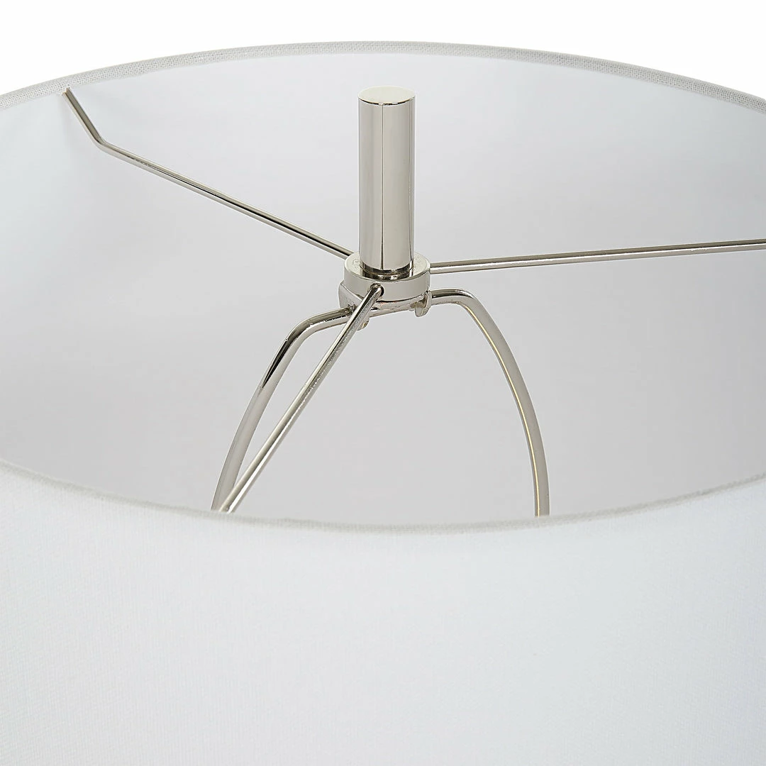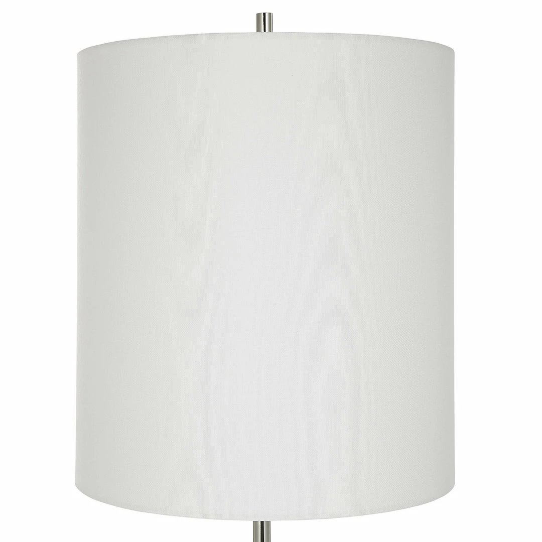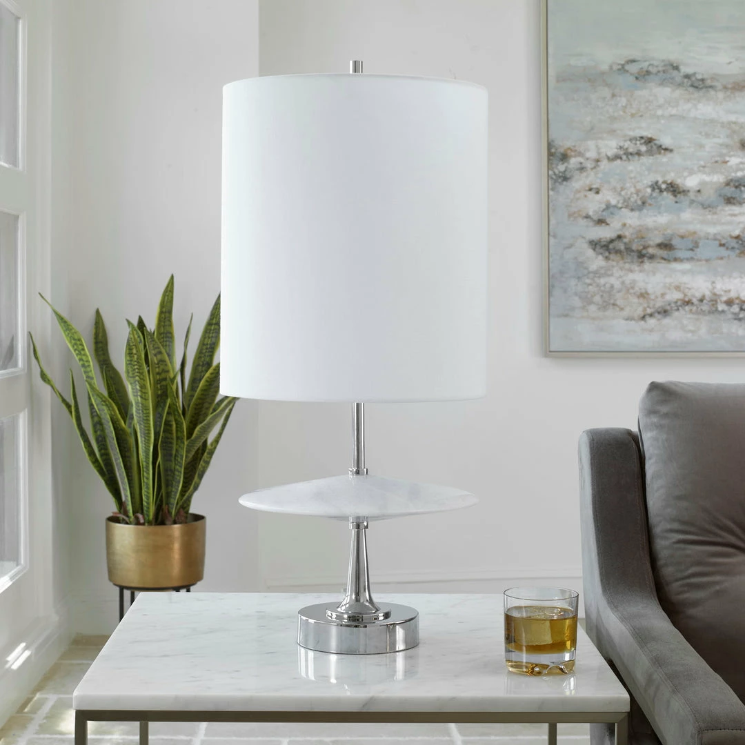 Displaying A Contemporary Feel, This Table Lamp Is Outfitted With A Polished White Marble Disk With Natural Gray Veining, Displayed Between Plated Polished Nickel, Tapered Iron Stand. A White Fabric Shade Completes The Piece.