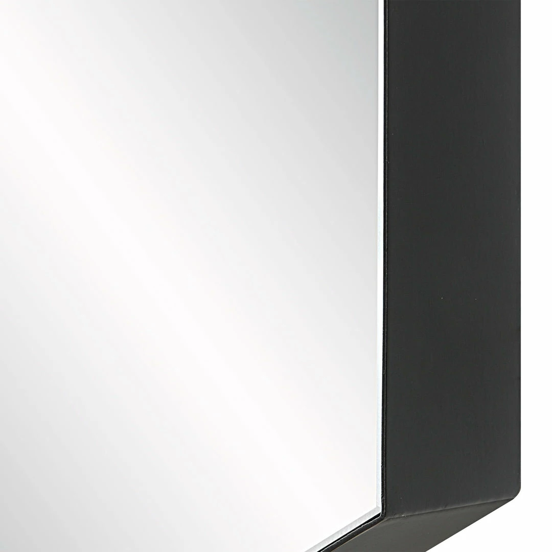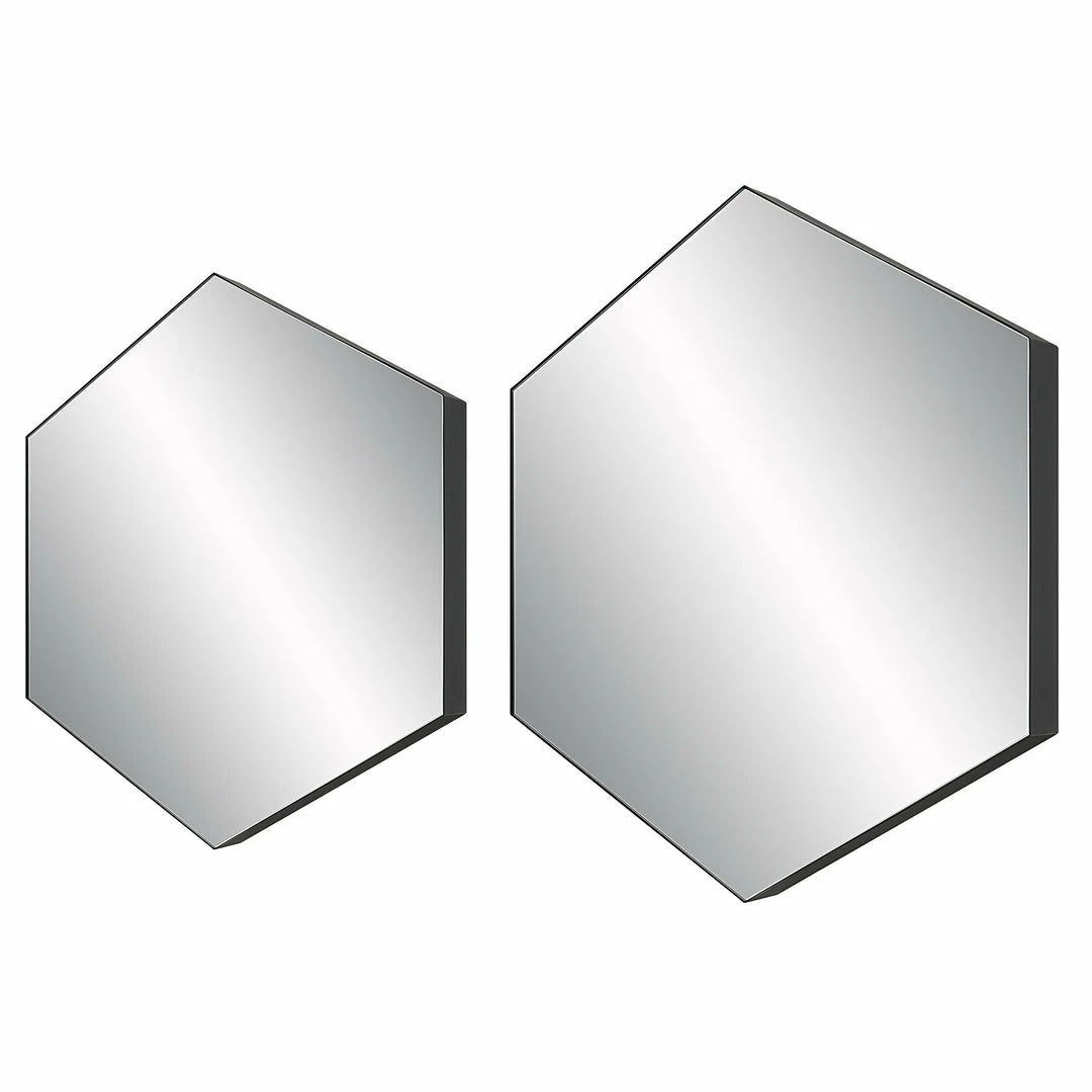 This Set Of Two Hexagon Mirrors Are Encased In Thick Iron Bands Finished In A Soft Matte Black. Each Mirror Has A 1″ Bevel And May Be Hung Horizontal Or Vertical.