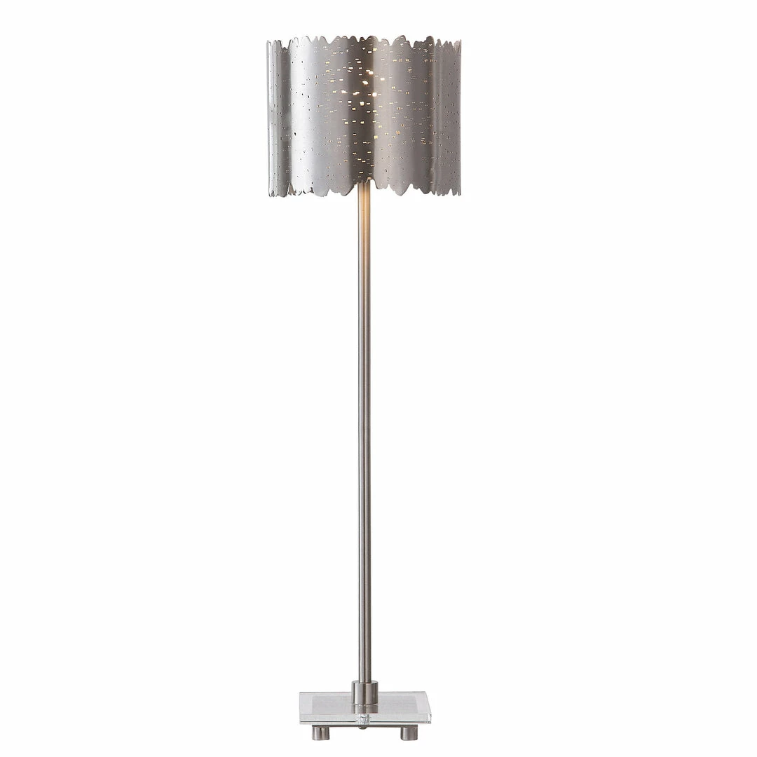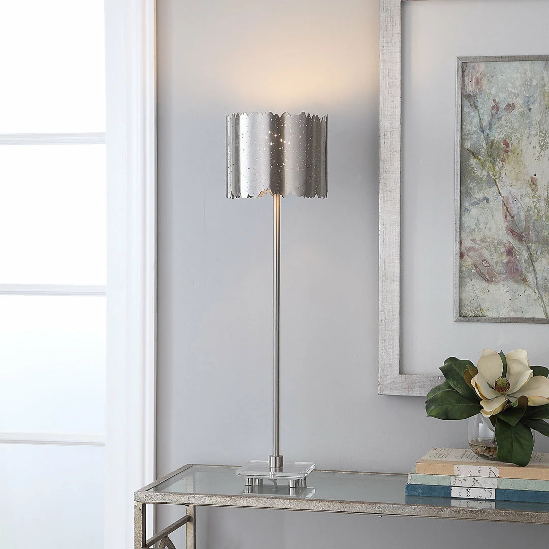 Modern In Design, This Polished Nickel Plated Buffet Lamp Features A Pierced Metal Shade With Raw Edges, Paired With A Thick Crystal Slab.