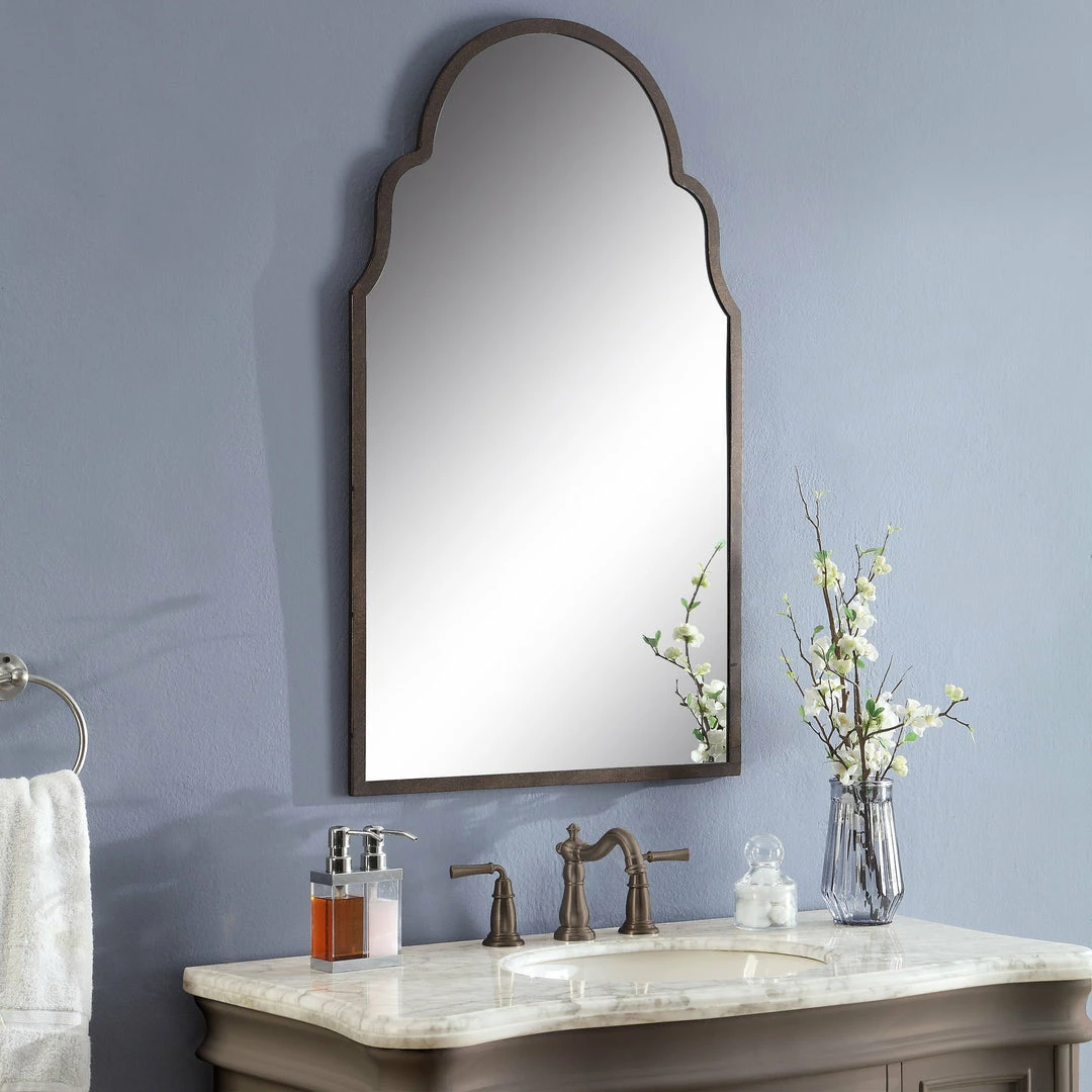 This Shaped Mirror Features A Hand Forged Metal Frame Finished In Lightly Textured, Dark Brown With Burnished Edges And Gold Highlights.