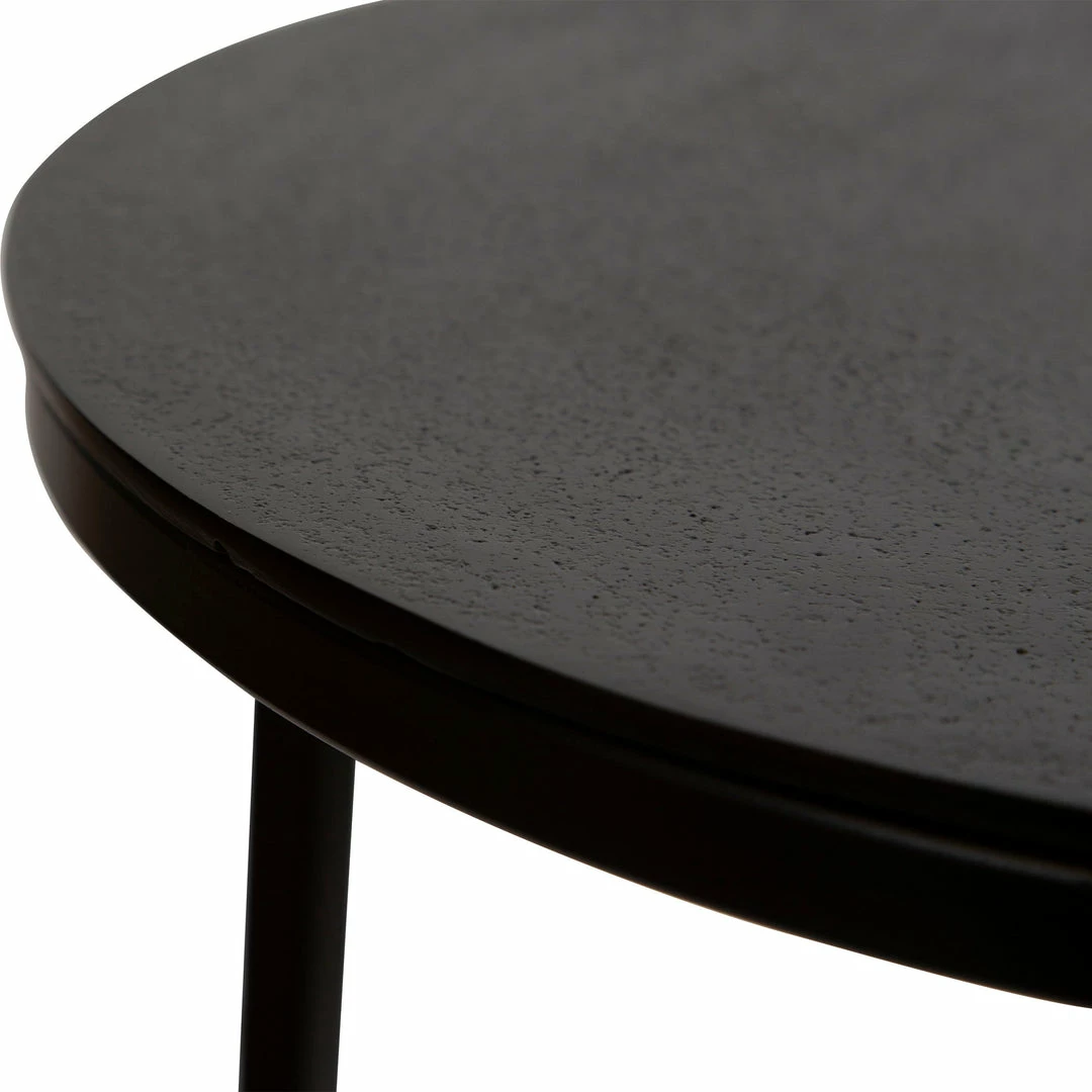 Modern And Streamlined, This Round Accent Table Is Constructed In An Aged Black Iron Featuring A Cast Textured Aluminum Slab Top Finished In A Plated Antique Bronze.
