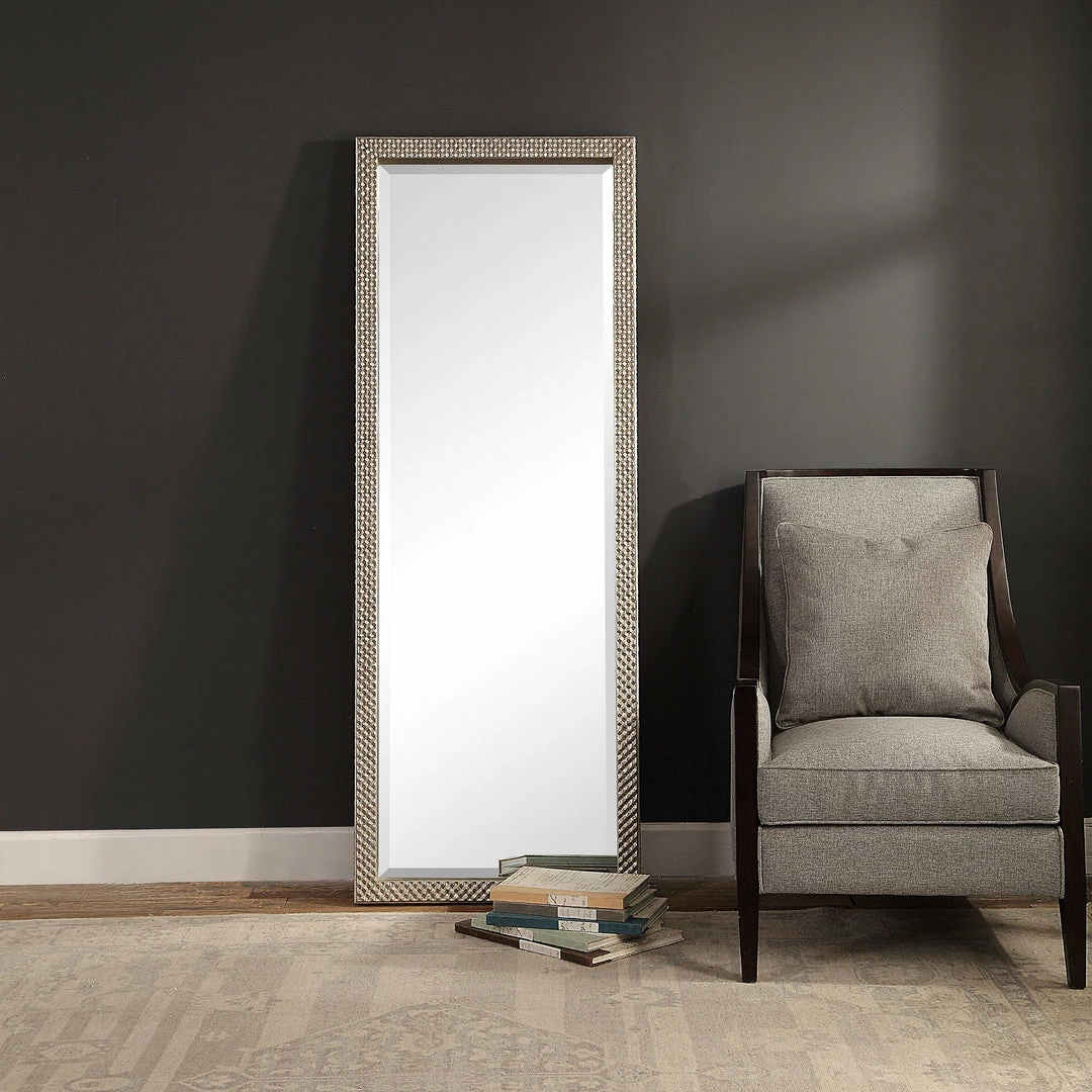 This Leaner Style Mirror Features A Solid Wood Frame Showcasing A Diamond Studded Texture On Face And Outside, Finished In A Lightly Antiqued Metallic Silver. Mirror Features A Generous 1 1/4″ Bevel And May Be Hung Horizontal Or Vertical.