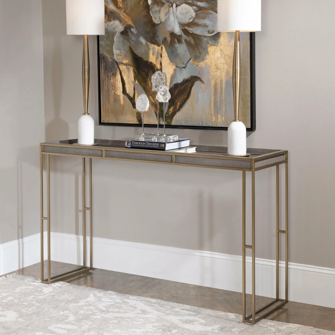 Exhibiting A Modern Minimalist Design, This Tray Style Console Table Features A Rich, Charcoal Gray Faux Shagreen Paired With A Plated Brushed Brass Steel Frame.