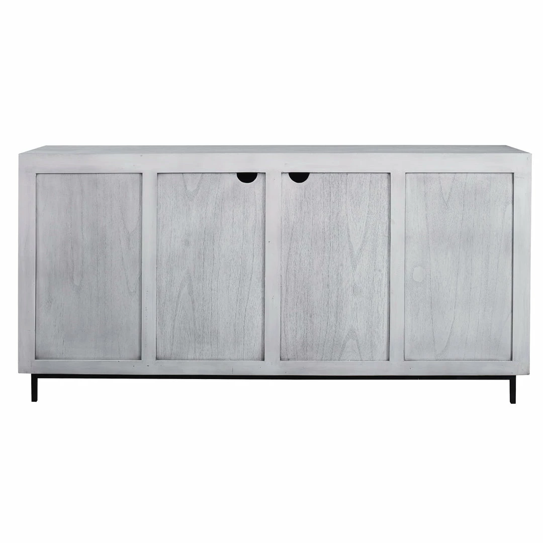 The Perfect Storage Cabinet Or The Focal Point Of Your Room, This Four Door Cabinet Is Constructed From Mahogany Wood In A Whitewashed Finish With Light Gray Distressing. Each Door Features A Reeded Tile Design In A Striking Pewter Gray Tone, With Matte Black Metal Legs. Both Right And Left Sides Open To Reveal One Adjustable Shelf.
