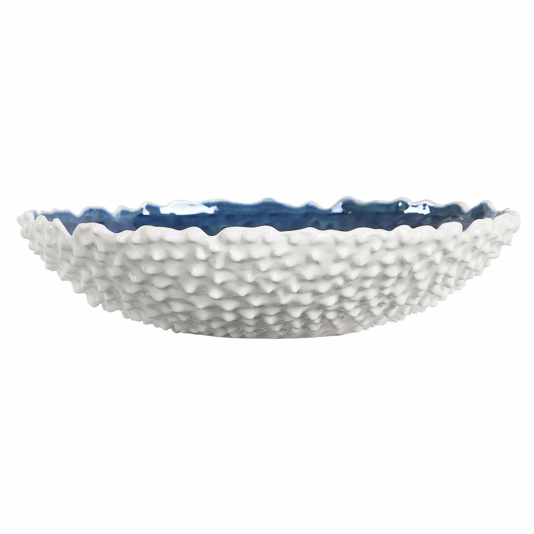 White Ceramic Bowl With Heavy Exterior Texture And A Bright Blue Interior Glaze.