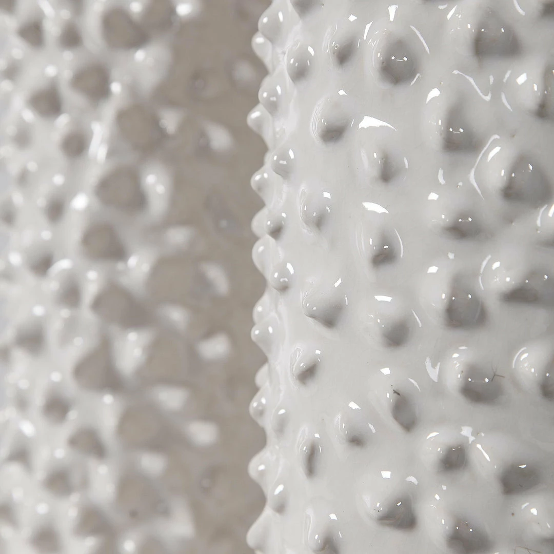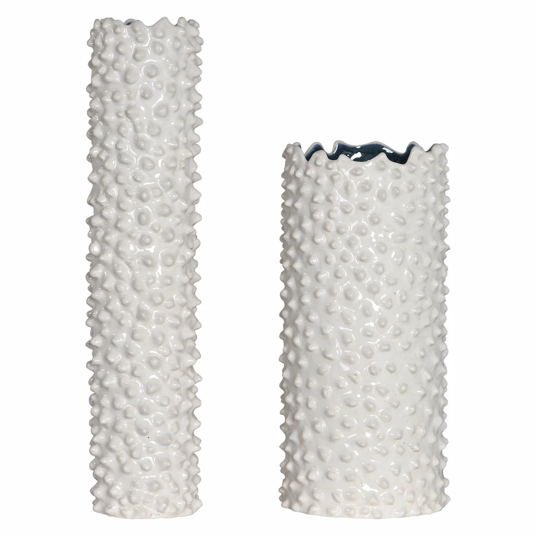 Set Of Two, White Ceramic Vases With Heavy Exterior Texture And A Bright Blue Interior Glaze. Sizes: Sm-6x14x6, Lg-4x18x4