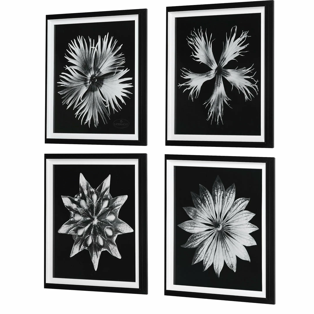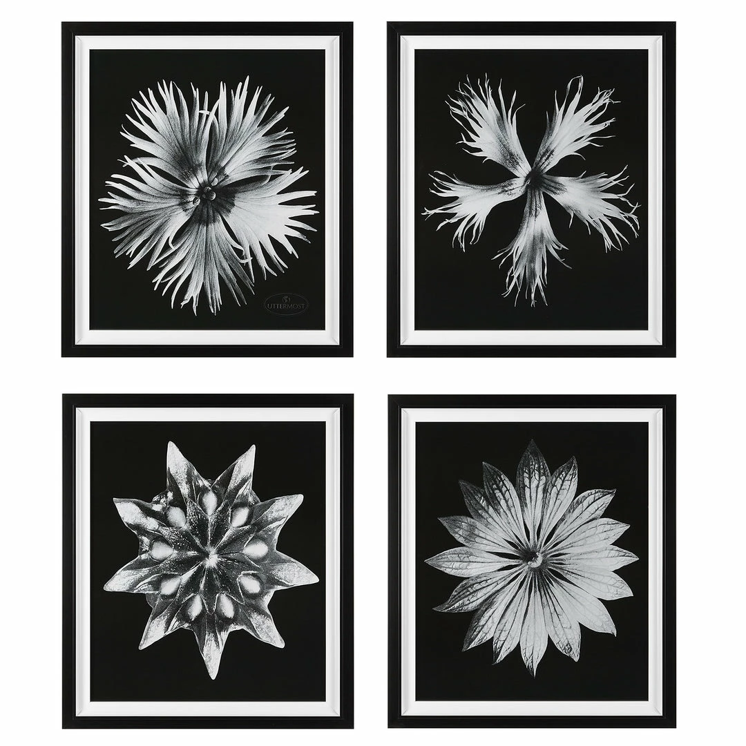 This Set Of Four Framed Prints Creates A Fresh Take On Traditional Floral Artwork. Each Black And White Image Is Accented By A Black Stepped Frame With A White Inner Liner Under Glass.
