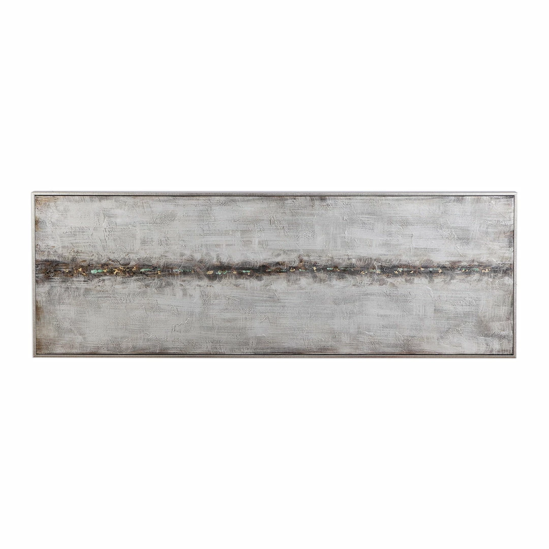 This Modern, Abstract Artwork On Canvas Complements Any Industrial Design. A Lightly Textured Silver Background Is Accented With Heavily Concentrated Gold Leaf, Sea Foam Green, Black, And Brown Hues Centered In The Middle Of This Hand Painted Piece. An Antiqued Silver Gallery Frame Surrounds The Artwork. Due To The Handcrafted Nature Of This Artwork, Each Piece May Have Subtle Differences. This Piece May Be Hung Horizontal Or Vertical.