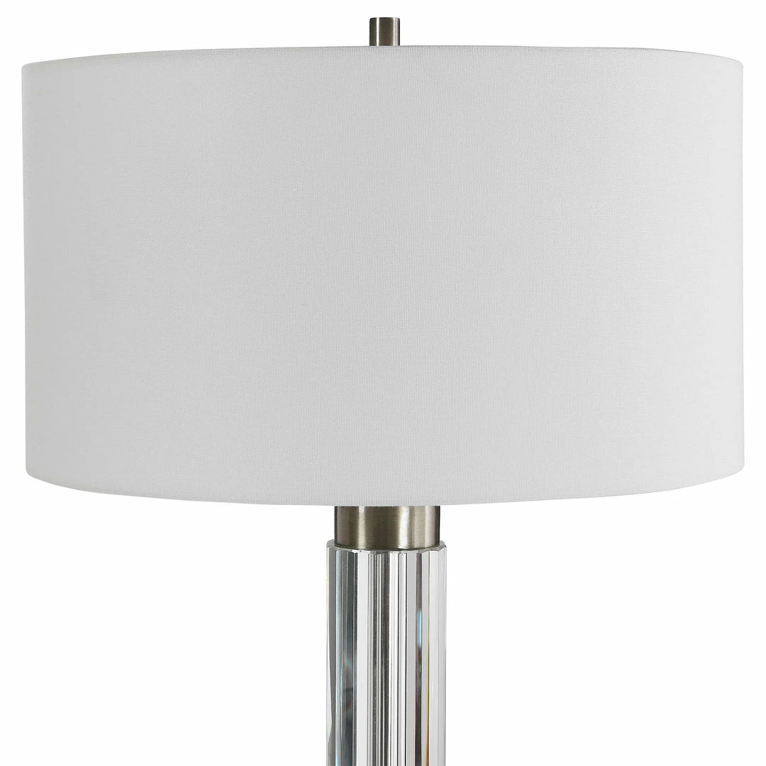 Contemporary In Style, This Cut Crystal Table Lamp Showcases Clean Lines, Accented With Lightly Antiqued Brass Plated Details. The Round Hardback Drum Shade Is A White Linen Fabric.