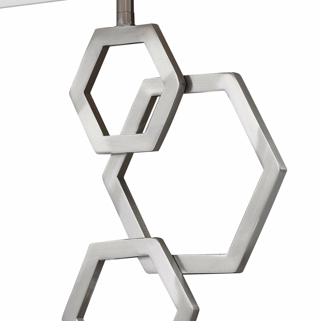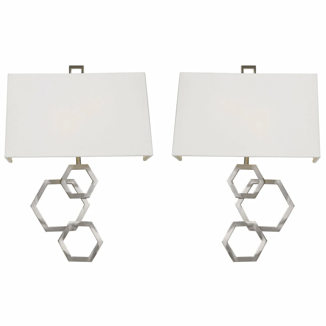 Our Rich Brushed Nickel 2 Lt Sconces With Stately Honeycomb Hexagon Geometric Cutout Shape Details And White Linen Hardback Shades Add Classic Elegance. Unique 2-pack Of Sconces, Featuring A Right And Left For A Balanced Set. 2-60 Watt Max, Candelabra Sockets In Each Sconce.