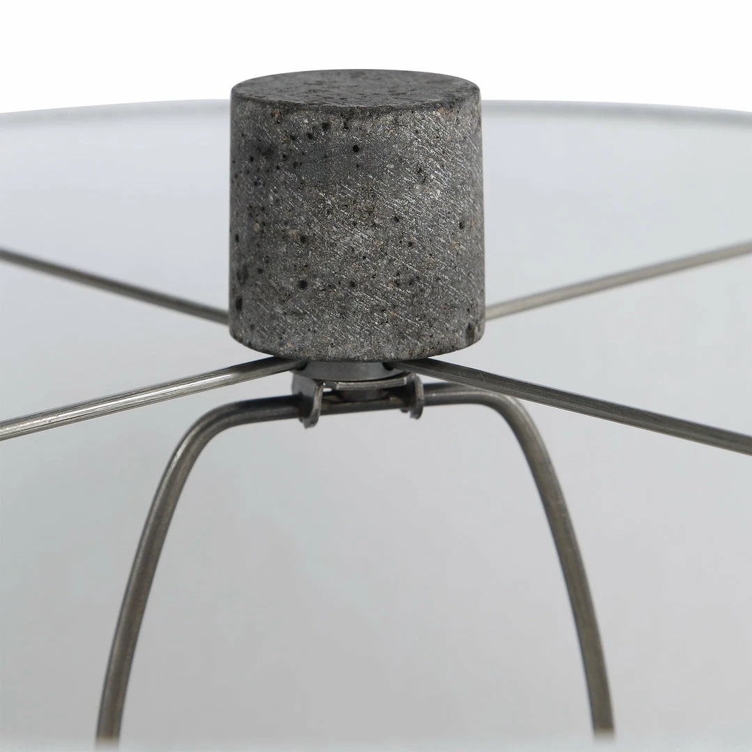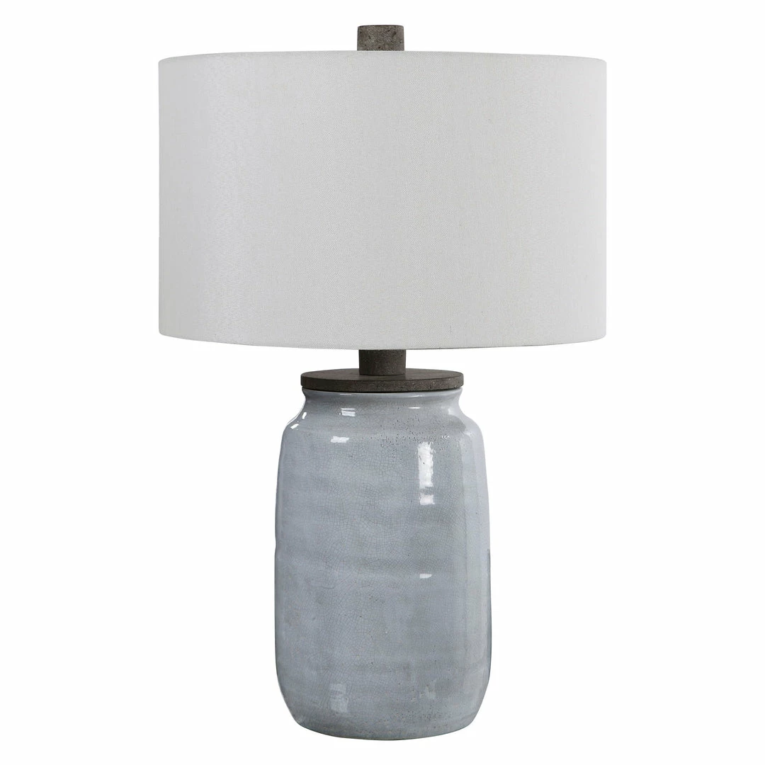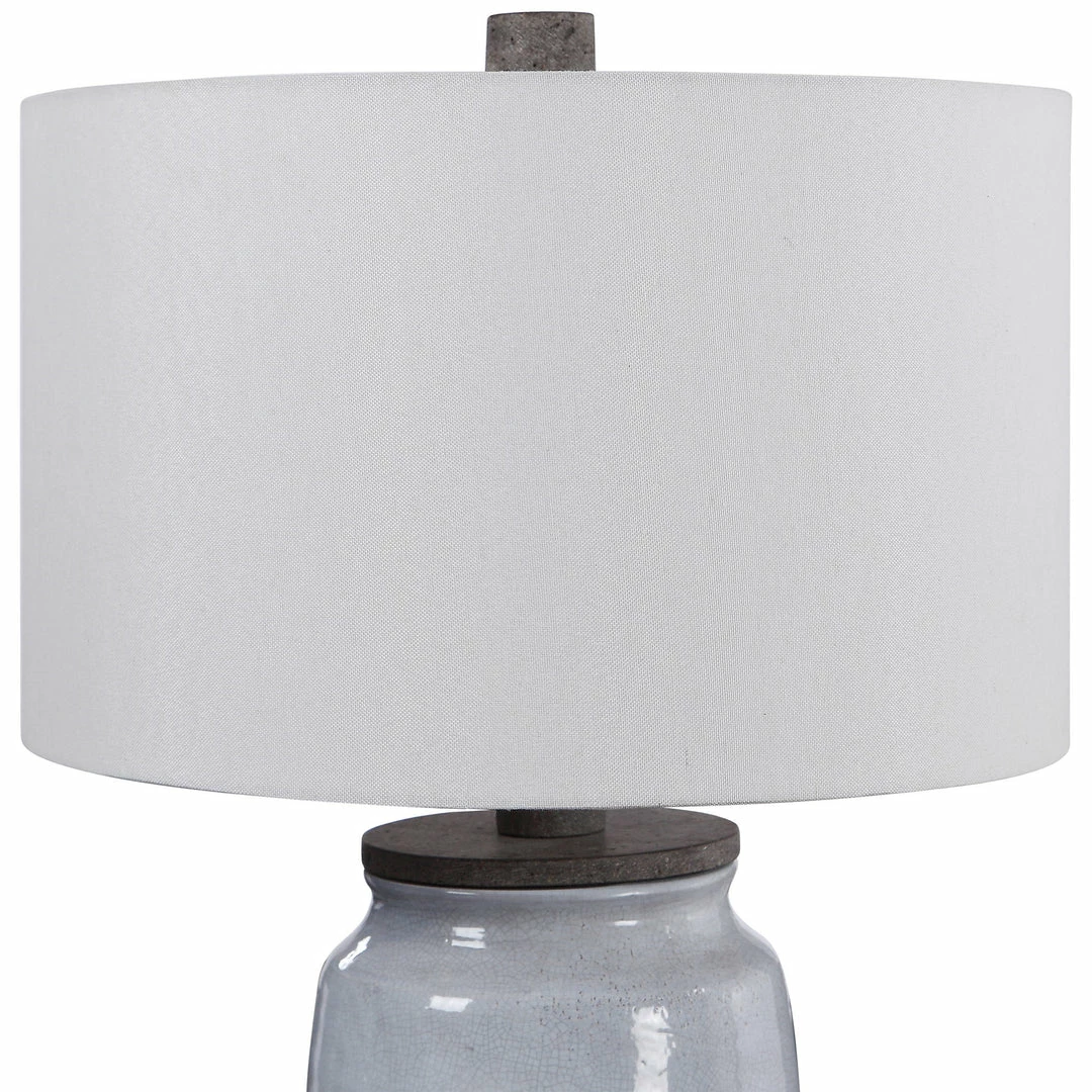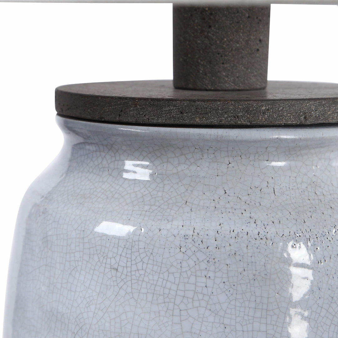 This Ceramic Table Lamp Is Finished In A Light Blue Crackle Glaze, Accented With Aged Charcoal-stained Concrete Details. The Round Hardback Drum Shade Is An Off-white Linen Fabric With Light Slubbing. Due To The Nature Of Fired Glazes On Ceramic Lamps, Finishes Will Vary Slightly.
