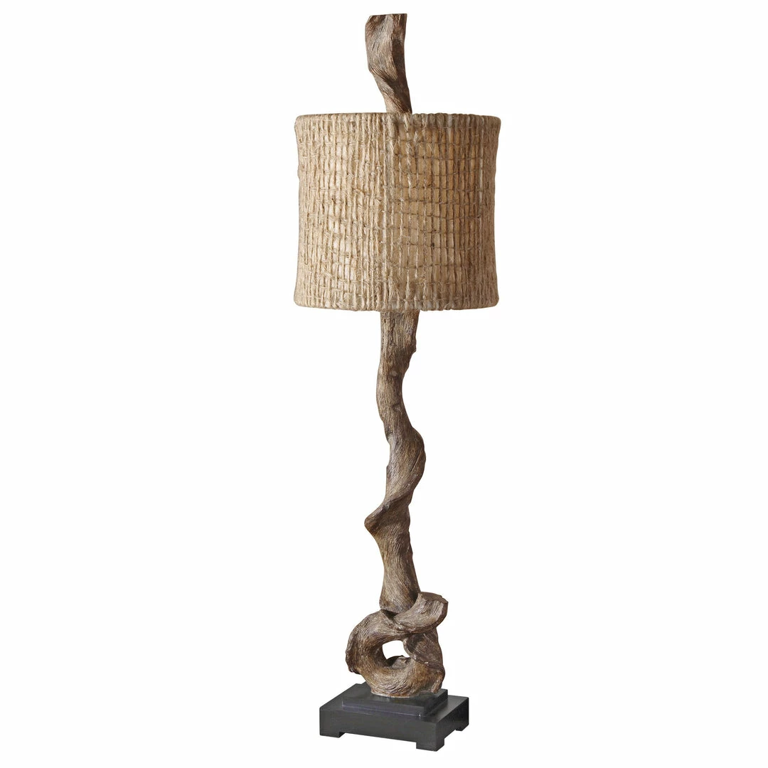 Weathered Driftwood Finish With A Matching Finial And A Matte Black Base. The Round Drum Shade Is Burlap Twine With An Open Weave Construction And A Beige Inner Liner.