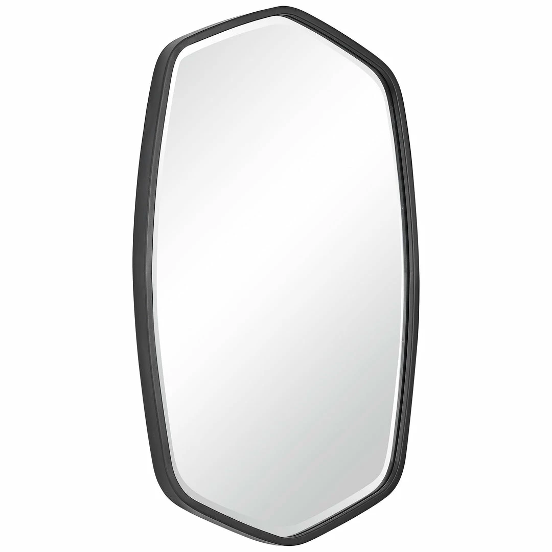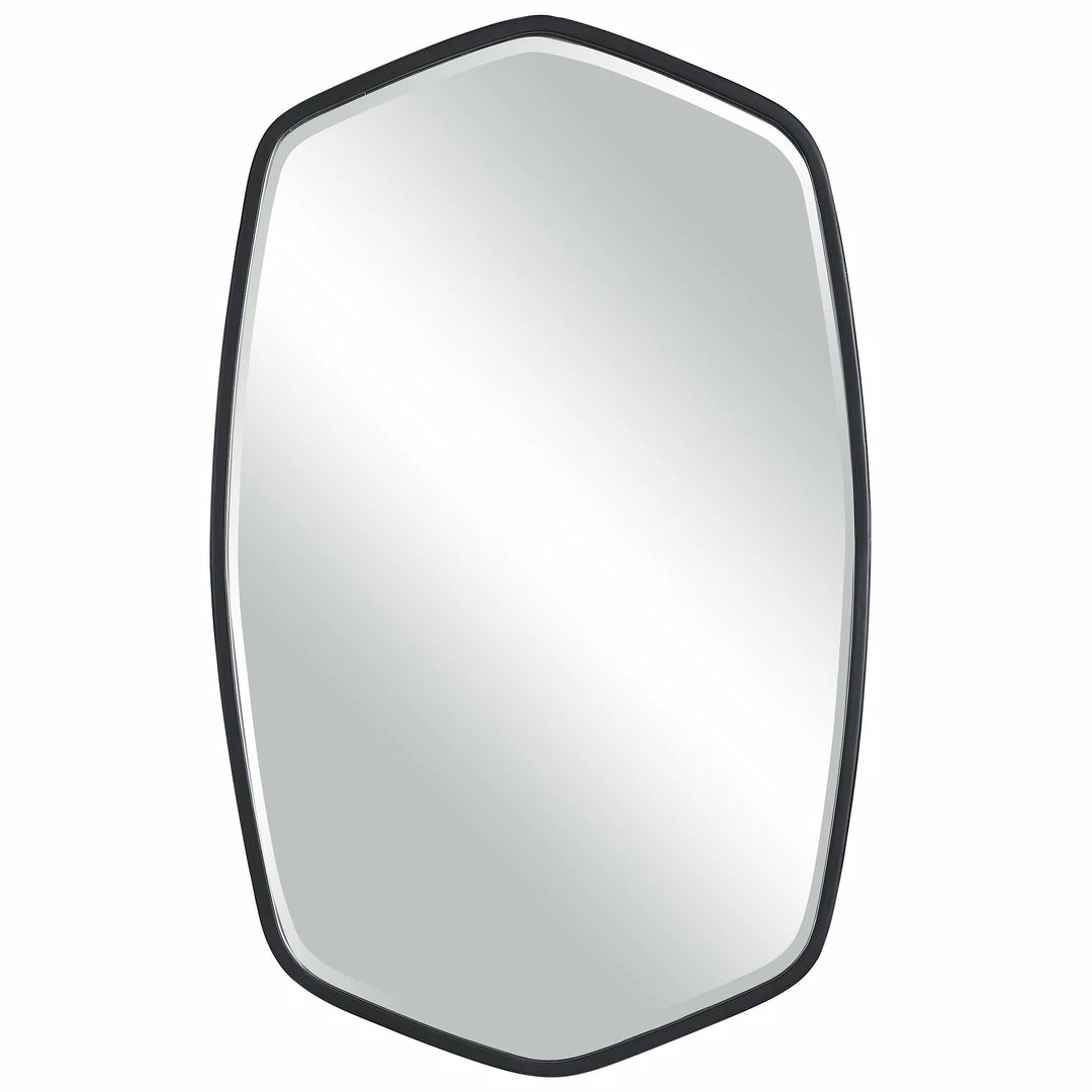 This Hand Forged Iron Mirror Frame Features A Unique Shape With Elegant Curves, Finished In A Streamlined Satin Black. Mirror Has A Generous 1 1/4″ Bevel.