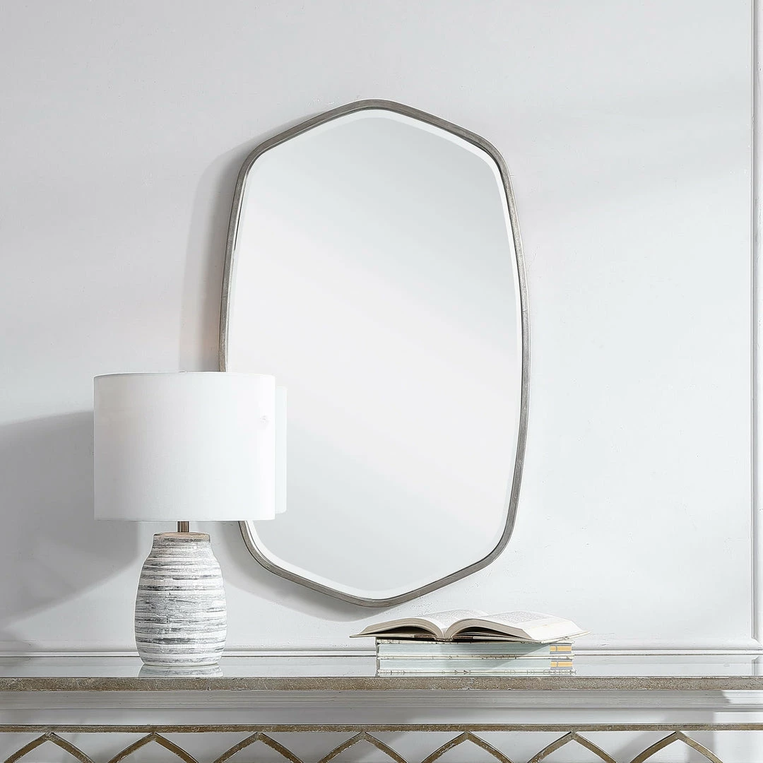 This Hand Forged Iron Mirror Frame Features A Unique Shape With Elegant Curves, Finished In A Versatile Silver Leaf. Mirror Has A Generous 1 1/4″ Bevel.