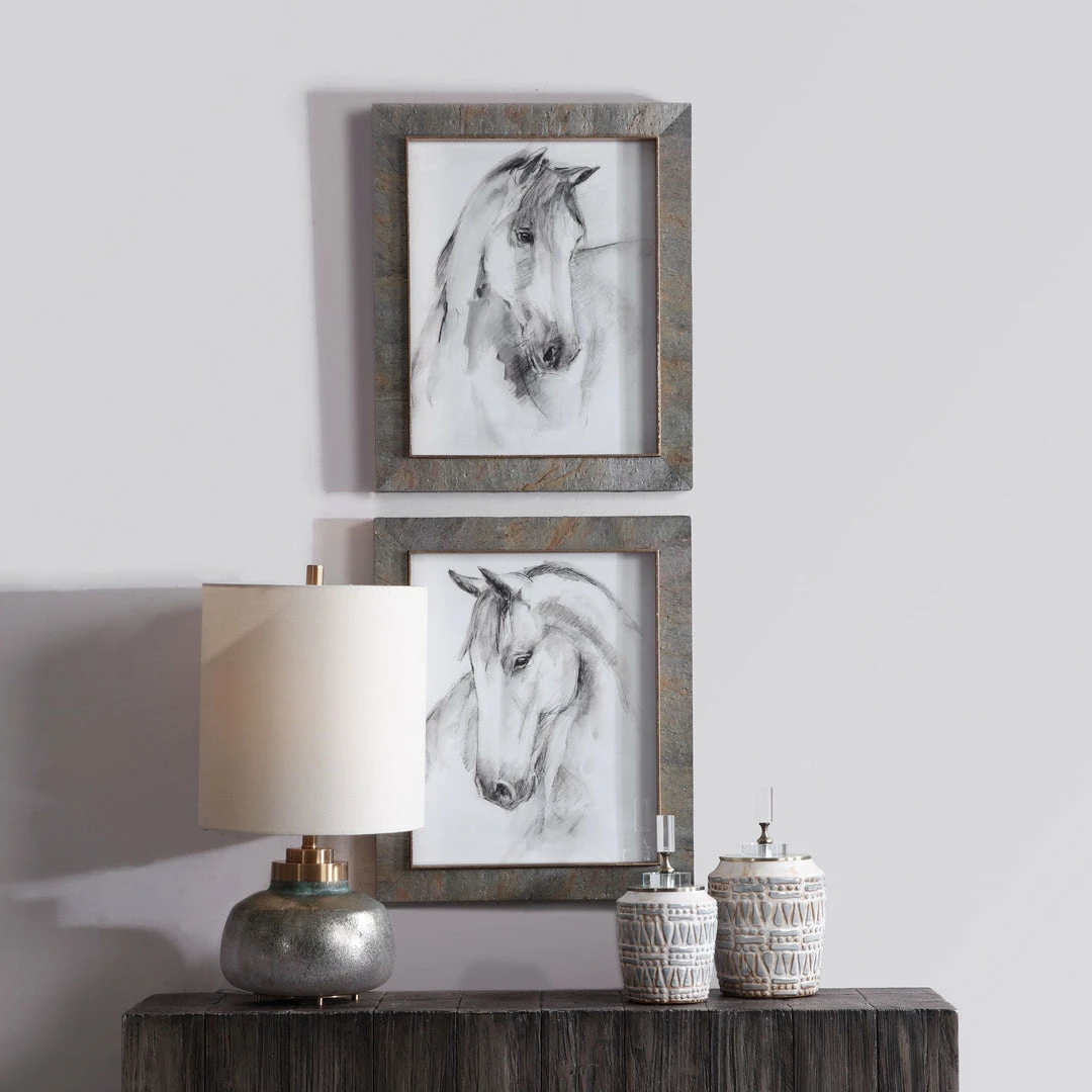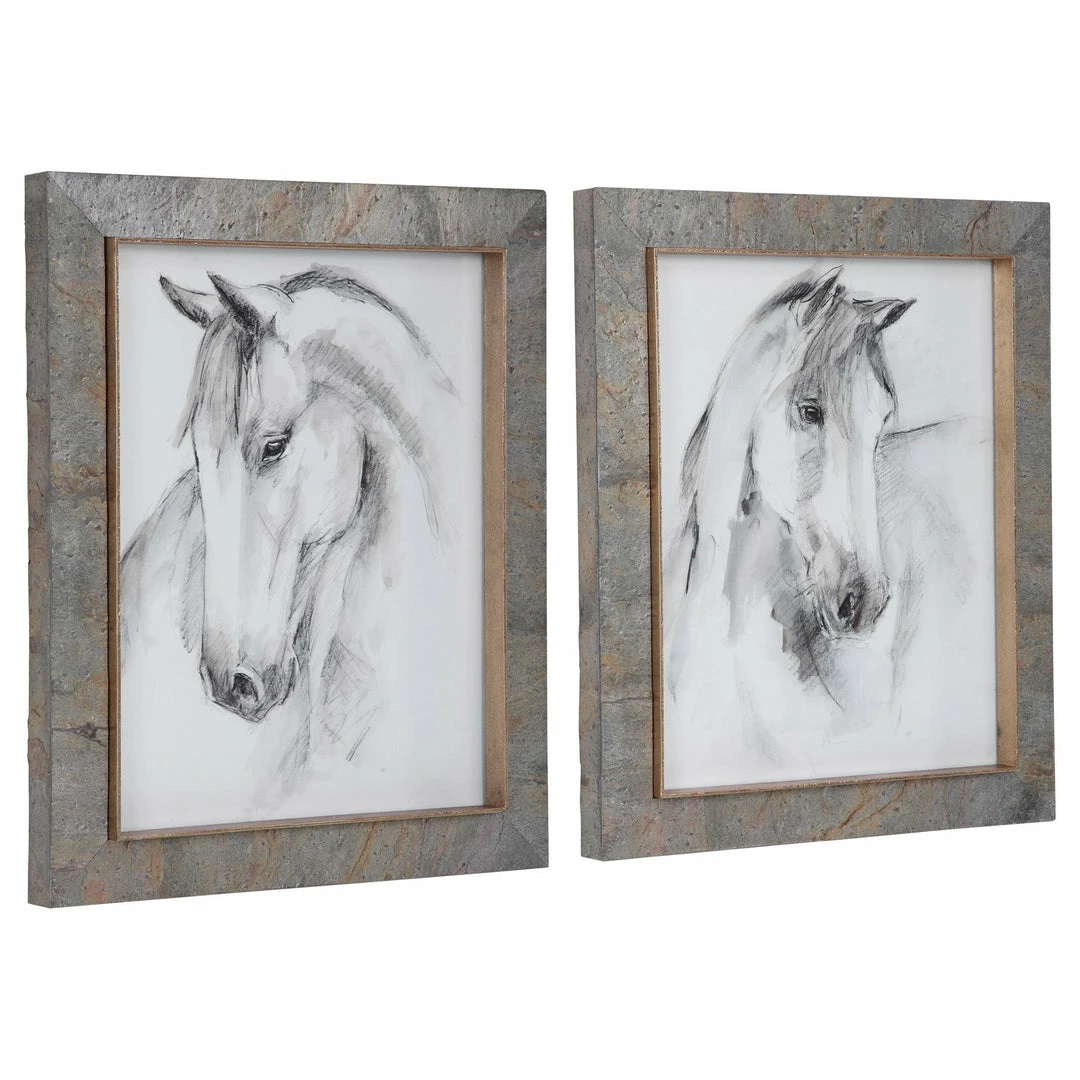Set Of Two Horse Sketches Are Finished In Shades Of White, Light Gray, And Taupe. Beautiful Natural Slate Frames Complement Each Print And Are Accented By Gold Leaf Finished Inner Fillets. Each Print Is Placed Under Glass. Artwork By Ethan Harper.