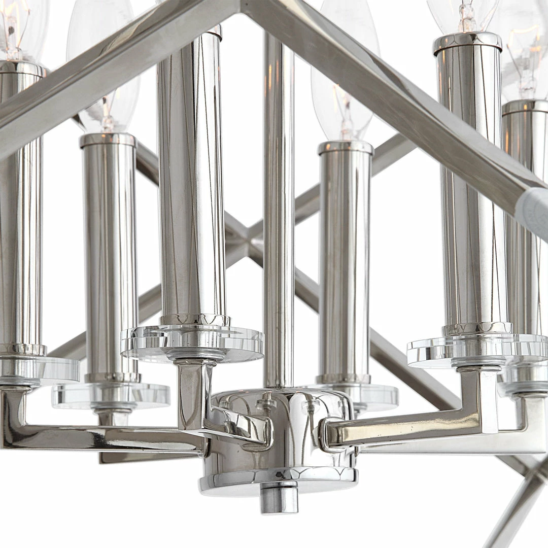 An Elegant, Polished Nickel Cube Interlocked With Its Twin, At The Center Of Their Intersection Is A 6 Light Candle Cluster With Mini Crystal Bobeches. Includes 15′ Wire And 7′ Chain For Adjustable Installation.