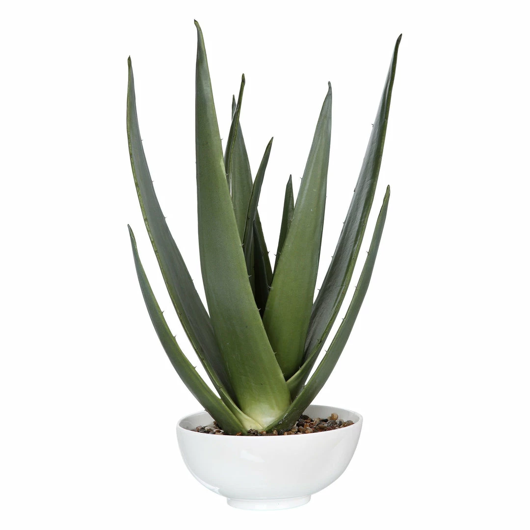 A Contemporary Aloe Vera Statement Piece, Accented With Natural Stones Set Into A Glossy White Textured Bowl.